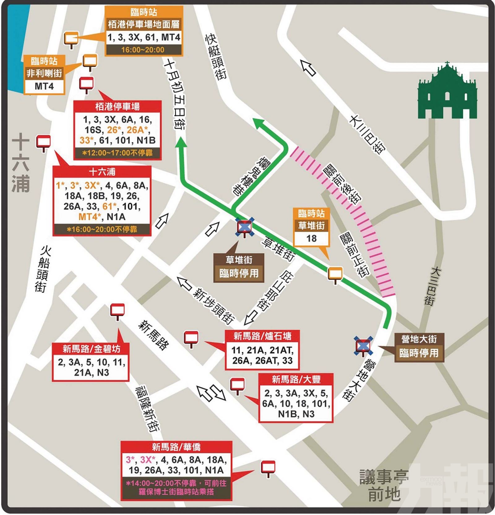 巴士服務方面,為配合行人專用區及節假日臨時分流安排,氹仔舊城區及關前後街周邊的巴士站點及路線實施以下臨時調整: