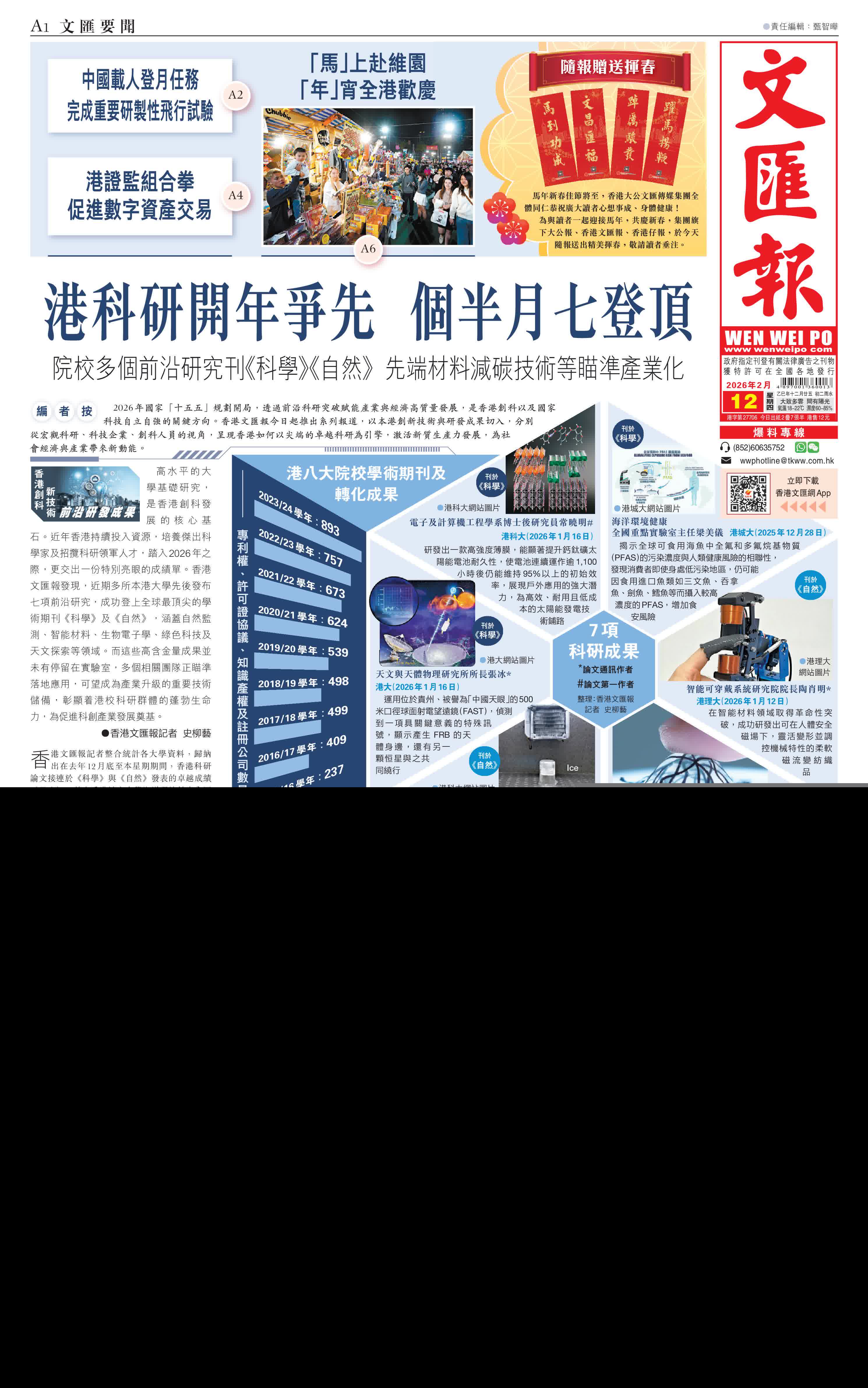 高水平的大學基礎研究,是香港創科發展的核心基石。近年香港持續投入資源,培養傑出科學家及招攬科研領軍人才,踏入2026年之際,更交出一份特別亮眼的成績單。香港文匯報發現,近期多所本港大學先後發布七項前沿研究,成功登上全球最頂尖的學術期刊《科學》及《自然》,涵蓋自然監測、智能材料、生物電子學、綠色科技及天文探索等領域。而這些高含金量成果並未有停留在實驗室,多個相關團隊正瞄準落地應用,可望成為產業升級的重要技術儲備,彰顯着港校科研群體的蓬勃生命力,為促進科創產業發展奠基。
