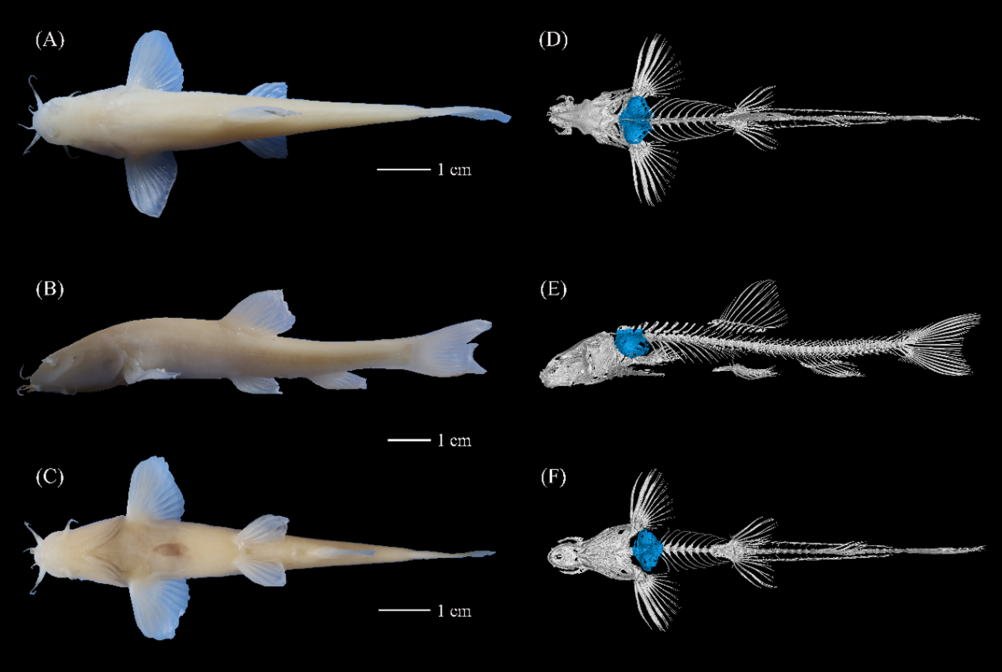 这是“纳雍盲高原鳅”的外形及骨骼对比图,研究人员从背面、侧面以及腹面对这一新种的外形和内部骨骼进行了对比。(受访者供图)