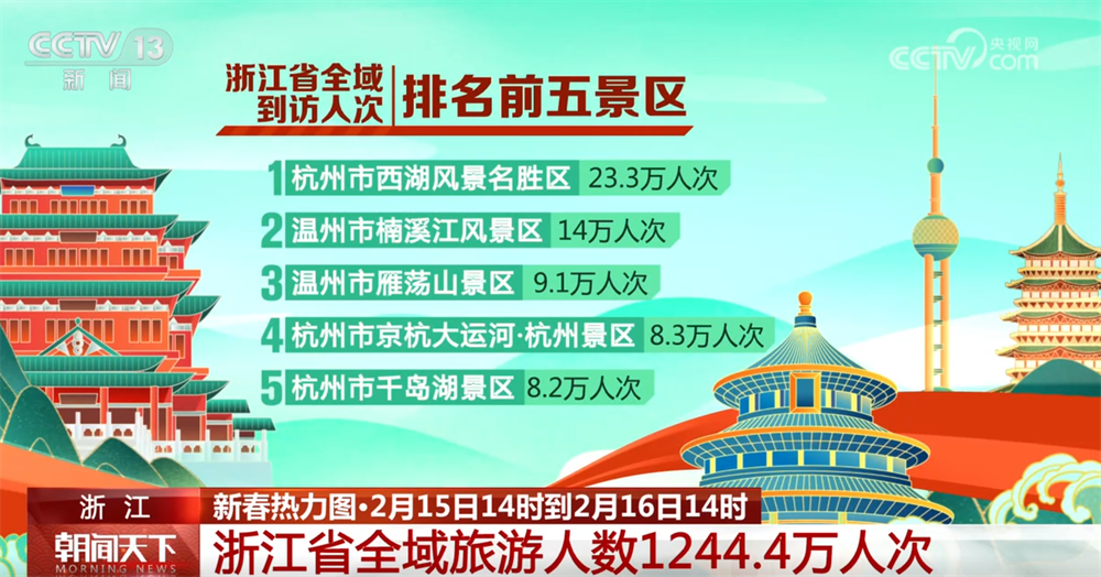浙江:2月15日14时到2月16日14时 浙江省全域旅游人数1244.4万人次