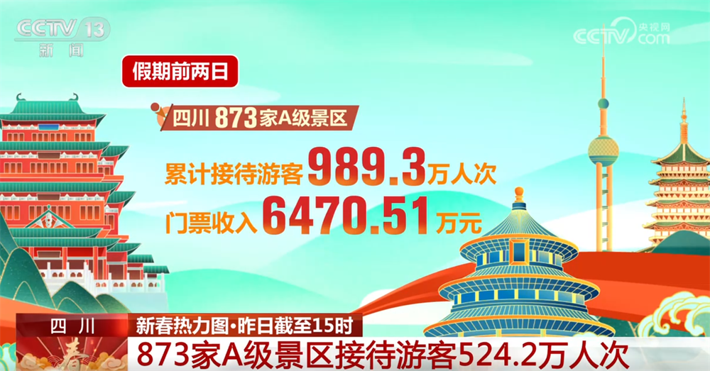 截至16日15时,四川全省纳入统计的873家A级景区接待游客524.2万人次、门票收入3334.19万元。其中,5A级旅游景区接待游客35.24万人次、实现门票收入814.16万元。