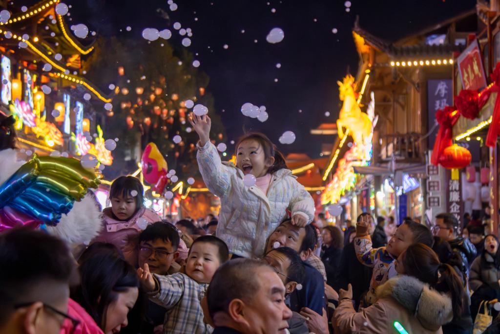 在湖北恩施,土家女儿城的夜晚被璀璨灯火点亮。新春非遗秀轮番上演,层层围观的游客不时举起手机,跟着节奏轻轻摇摆。