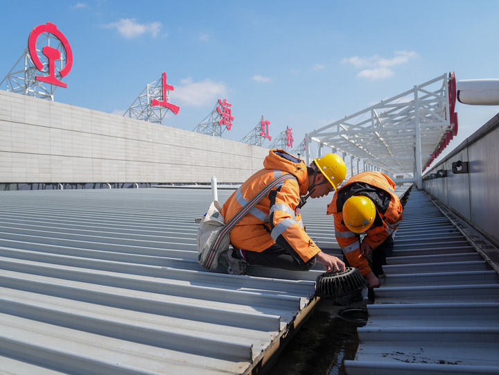 2月17日,中国铁路上海局集团有限公司上海房建公寓段的工作人员在上海虹桥火车站的屋面钢结构上清理垃圾。新华社记者 丁汀 摄