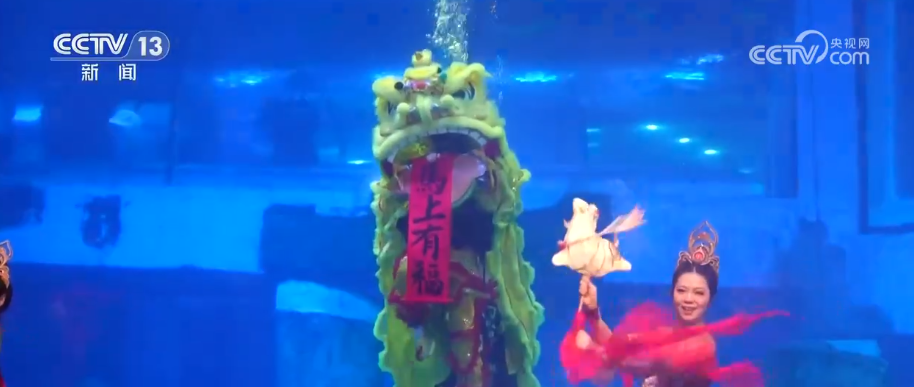 紧接着,岭南醒狮也“舞”进了水里。“狮子”灵活穿梭,时而摇头摆尾,时而腾跃翻滚。随后,敦煌飞天舞者与水下醒狮联动共舞,醒狮口中吐出“马上有福”的条幅,向观众献上新春祝福。