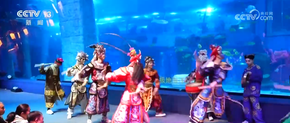 在巨大海底展缸前,急促的锣鼓声率先响起,来自广东潮汕地区的英歌舞队登场。队员们绘脸谱、穿鲜艳戏服,手持短木槌,随着鼓点整齐敲击,刚劲有力的动作和豪迈的阵列瞬间点燃现场气氛。