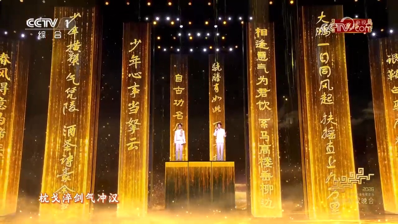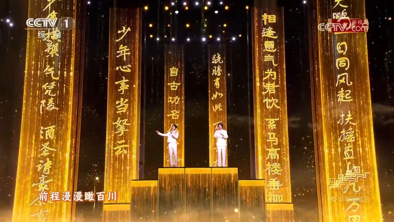 这首歌是总台春晚团队为马年量身打造的原创作品。以“少年意气”为魂,以古典诗词为骨,在辞旧迎新的时刻,唤起每个人心底那份初心滚烫、热烈赤诚的人生态度。舞台之上,两位歌手身着白金配色新中式西装,呼应“白衣少年”的纯净意象;金色流光与诗词投影交织,构建出时空交错的沉浸场景。