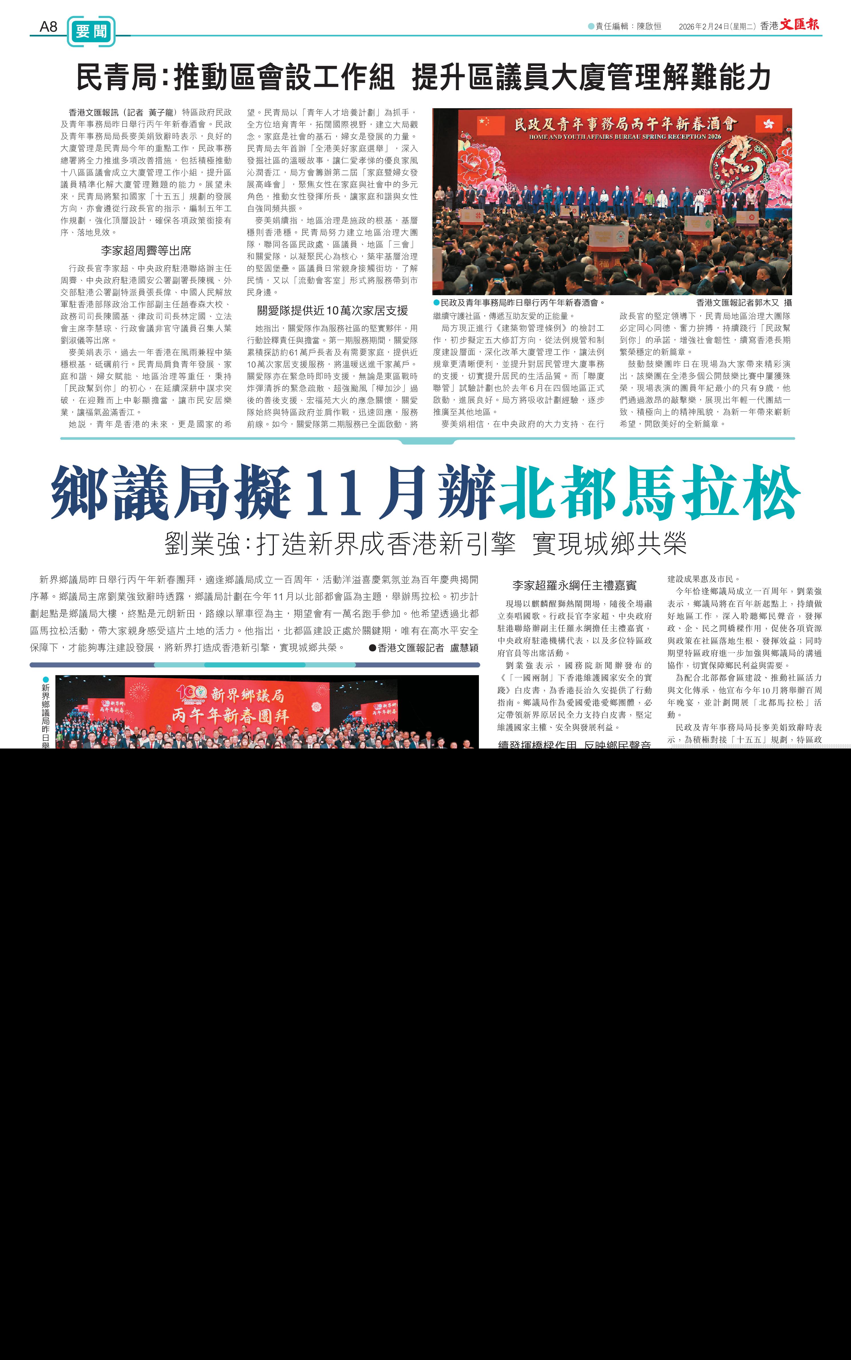 香港文匯報訊(記者 黃子龍)特區政府民政及青年事務局昨日舉行丙午年新春酒會。民政及青年事務局局長麥美娟致辭時表示,良好的大廈管理是民青局今年的重點工作,民政事務總署將全力推進多項改善措施,包括積極推動十八區區議會成立大廈管理工作小組,提升區議員精準化解大廈管理難題的能力。展望未來,民青局將緊扣國家「十五五」規劃的發展方向,亦會遵從行政長官的指示,編制五年工作規劃,強化頂層設計,確保各項政策銜接有序、落地見效。
