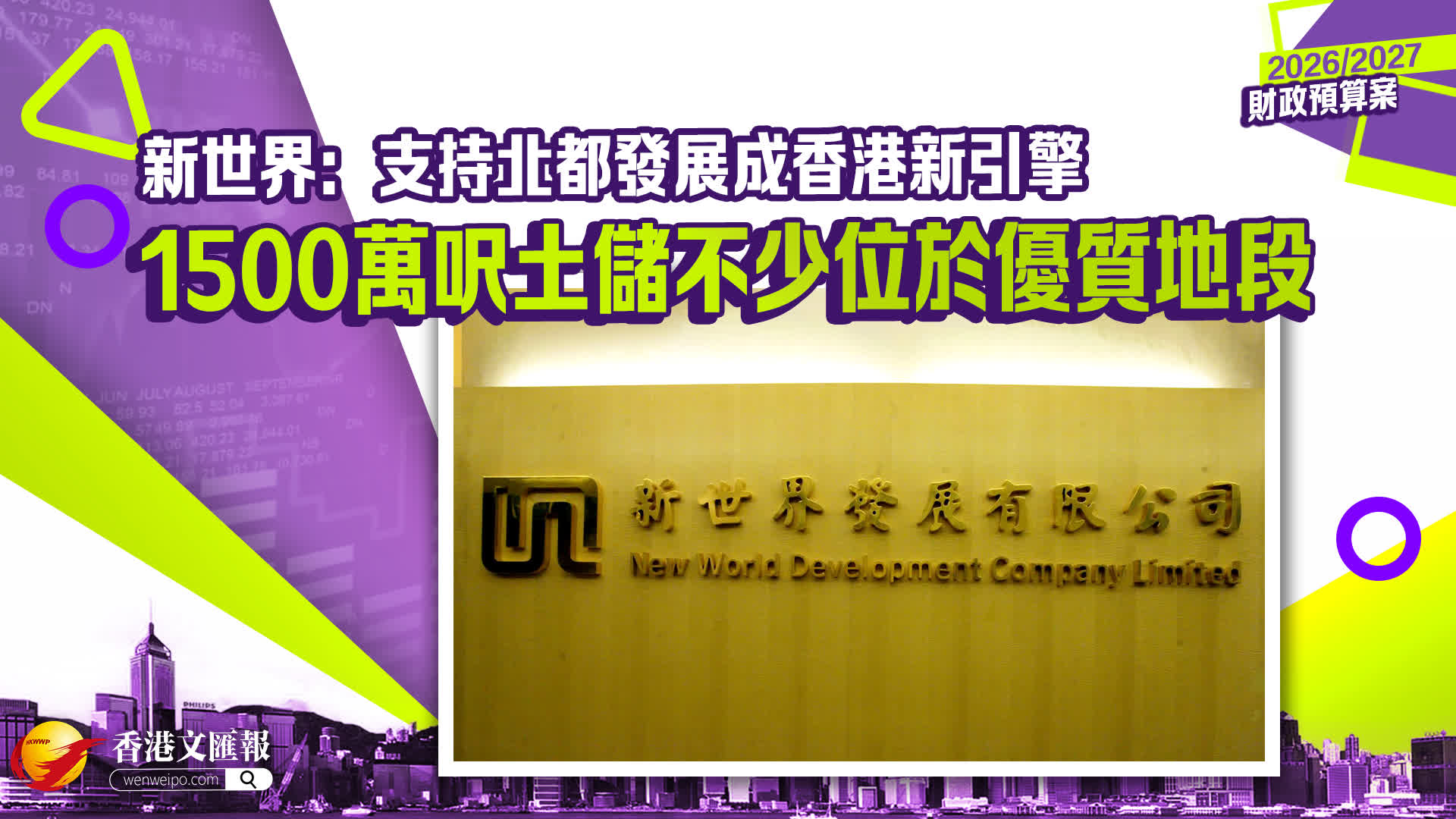 新世界發展發言人表示,集團歡迎政府最新發表的《財政預算案》,並支持加快發展北部都會區,以作為香港發展新引擎。集團目前擁有約1,500萬方呎土地儲備,不少位於北部都會區的優質地段,包括新田科技城一帶,故支持政府提出成立專屬公司推動開發新田科技城,並擬注資100億元起始資金,相信將有助於該區的提速發展。