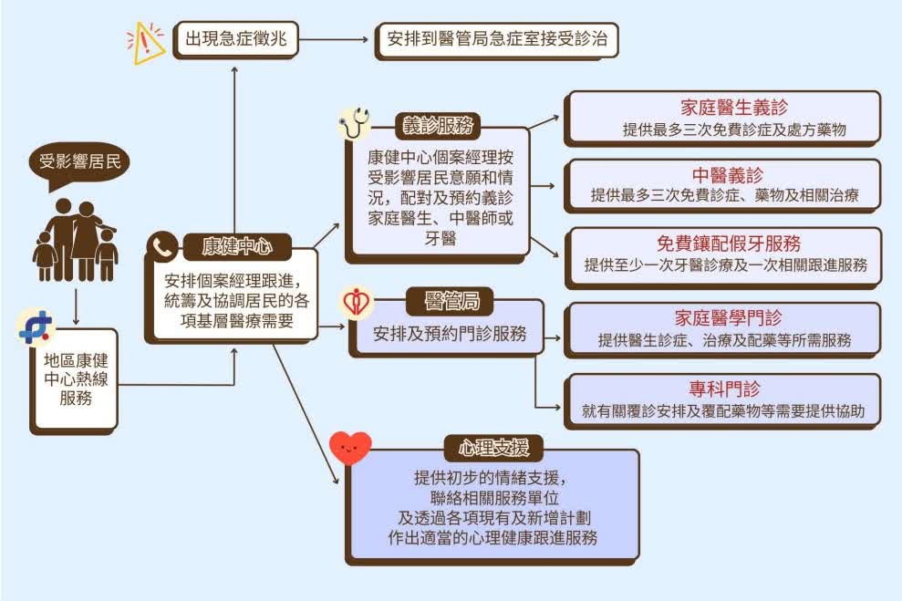 醫衞局自去年12月起推出家庭醫生義診計劃、中醫義診服務和牙醫免費鑲配假牙服務,支援受影響居民的基層醫療服務需要。康健中心個案經理會按情況及居民意願,安排他們接受家庭醫生和中醫各3次免費診症,服務涵蓋藥物及相關治療;以及至少一次免費牙醫診療及一次跟進服務(視乎診療需要),服務涵蓋鑲配假牙和口腔治療服務。截至2月24日,康健中心累計已處理合共224宗轉介。