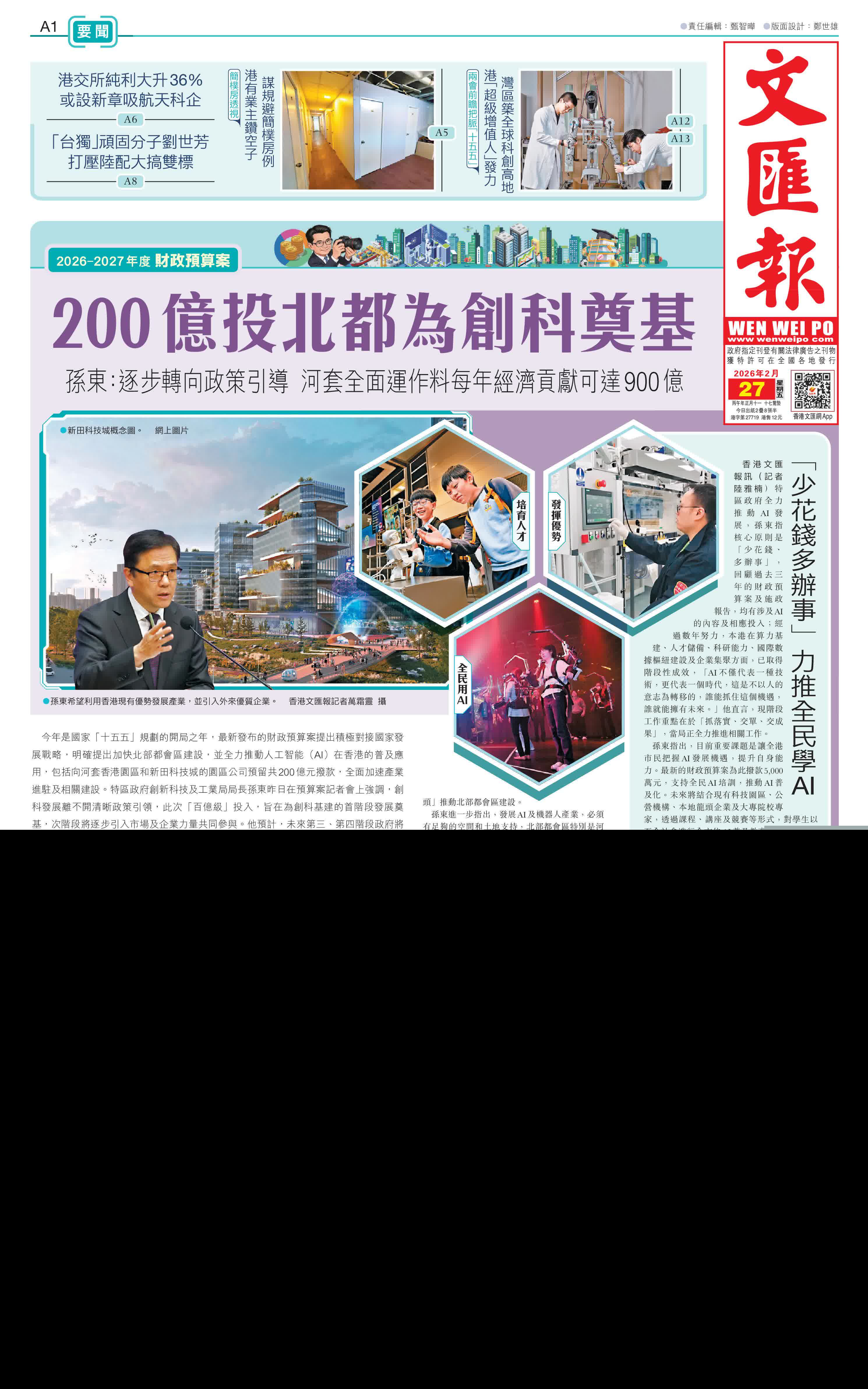 (香港文匯報記者 陸雅楠)今年是國家「十五五」規劃的開局之年,最新發布的財政預算案提出積極對接國家發展戰略,明確提出加快北部都會區建設,並全力推動人工智能(AI)在香港的普及應用,包括向河套香港園區和新田科技城的園區公司預留共200億元撥款,全面加速產業進駐及相關建設。特區政府創新科技及工業局局長孫東昨日在預算案記者會上強調,創科發展離不開清晰政策引領,此次「百億級」投入,旨在為創科基建的首階段發展奠基,次階段將逐步引入市場及企業力量共同參與。他預計,未來第三、第四階段政府將逐步由主導角色轉向政策引導,進一步吸納更多私人資本,期望為業界樹立成功典範,增強投資信心。根據初步估算,河套香港園區全面運作後,每年可望帶來約500億至900億元的經濟貢獻。