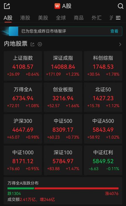 全市成交额2.41万亿,超4000只个股上涨。