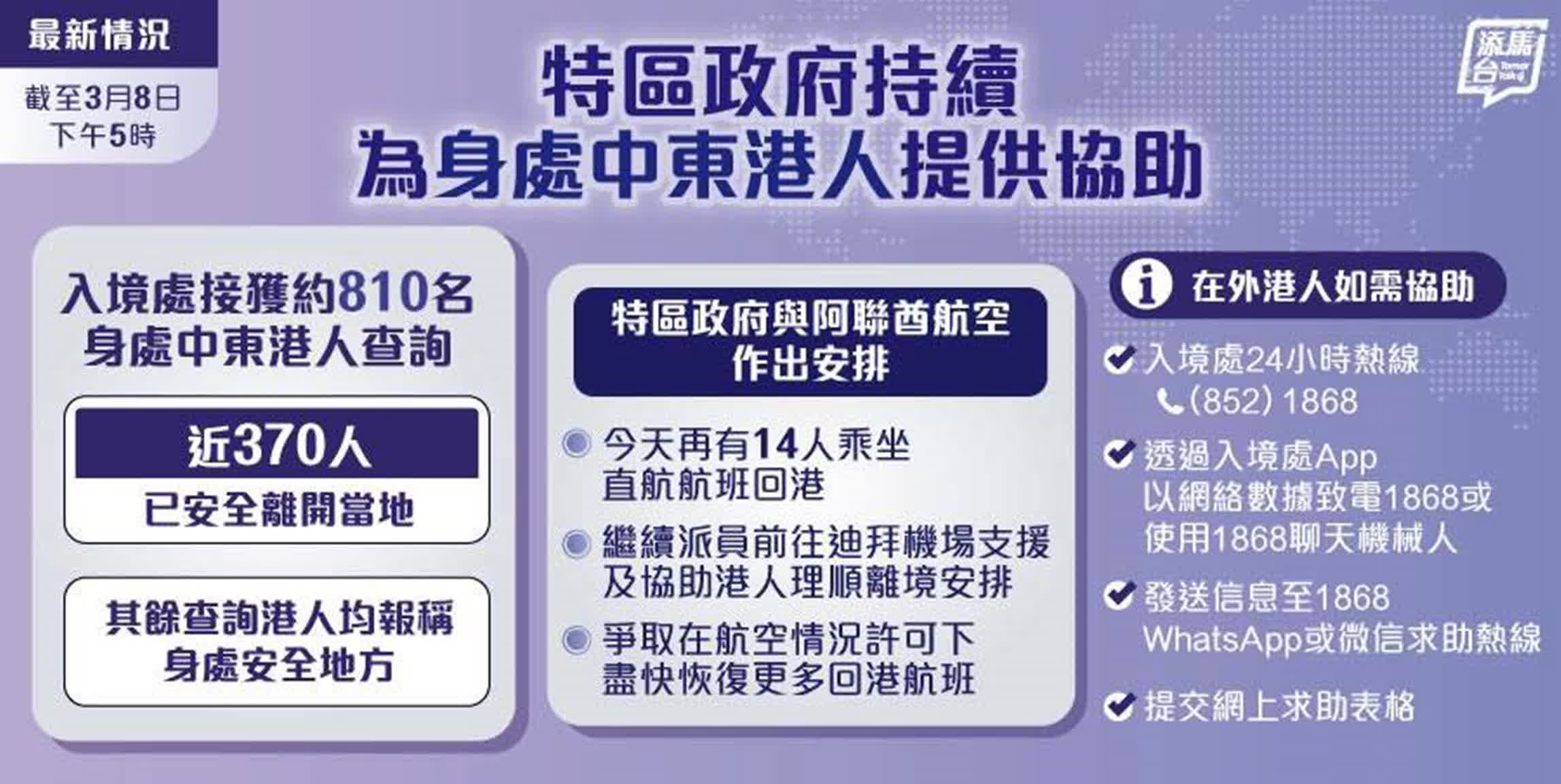另外,截至今日下午5時,入境事務處共接獲約810名身在中東地區的港人查詢,包括最新航班及行程安排,當中近370人已安全離開當地,其餘查詢港人均報稱身處安全地方。入境事務處會繼續與查詢的港人保持聯絡。