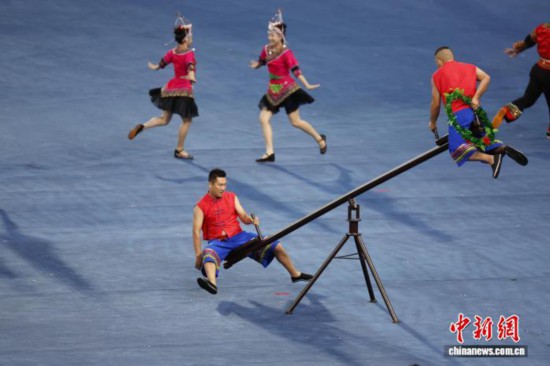 2023年9月23日,在杭州亚运会开幕式仪式前表演中,畲族传统体育项目《稳凳和摇锅》登上舞台。 中新社记者 杜洋 摄