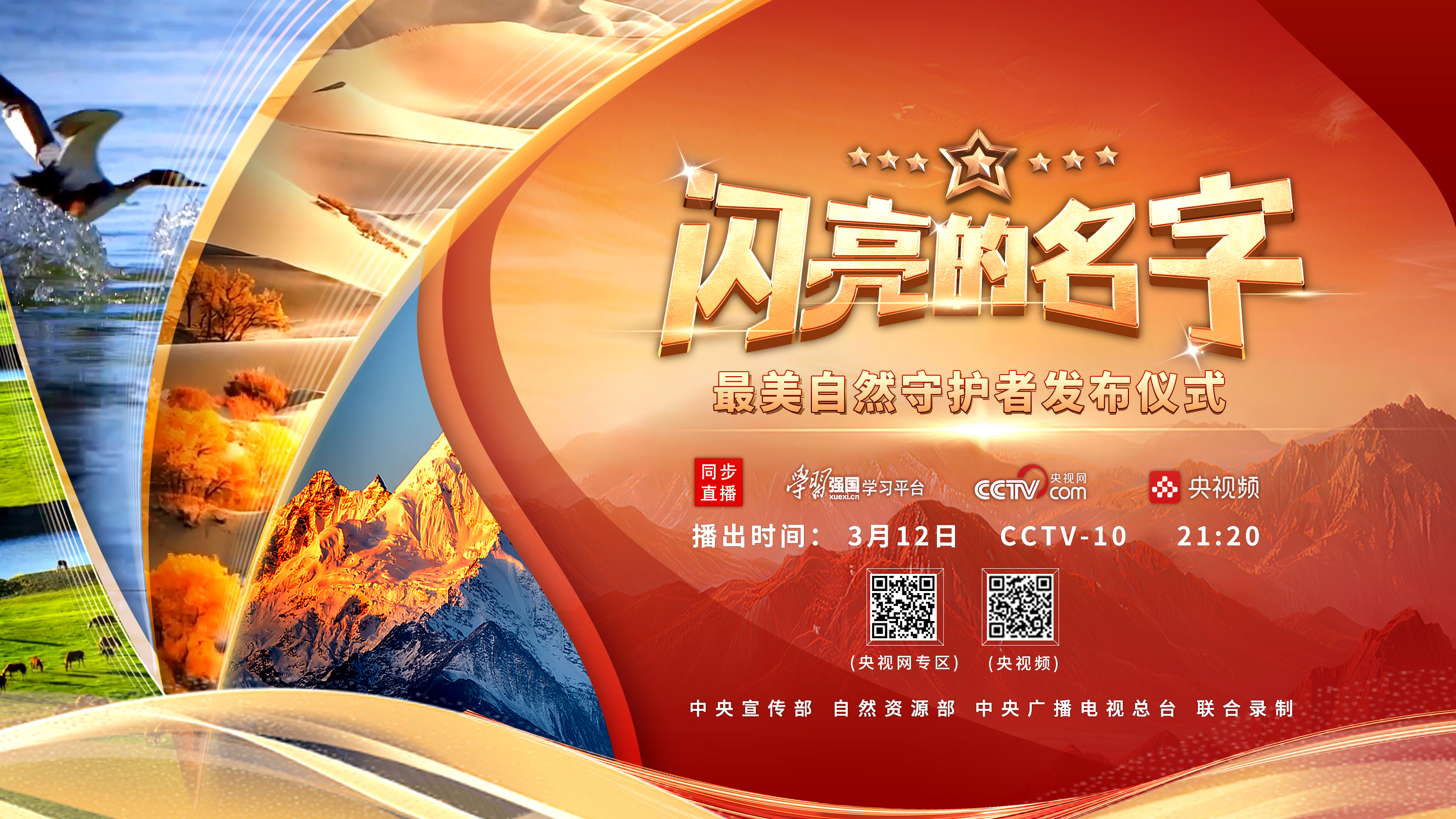 《闪亮的名字-最美自然守护者发布仪式》将在中央广播电视总台央视科教频道(CCTV-10)3月12日21:20播出。播出期间央视频、学习强国、央视网等新媒体平台同步直播。
