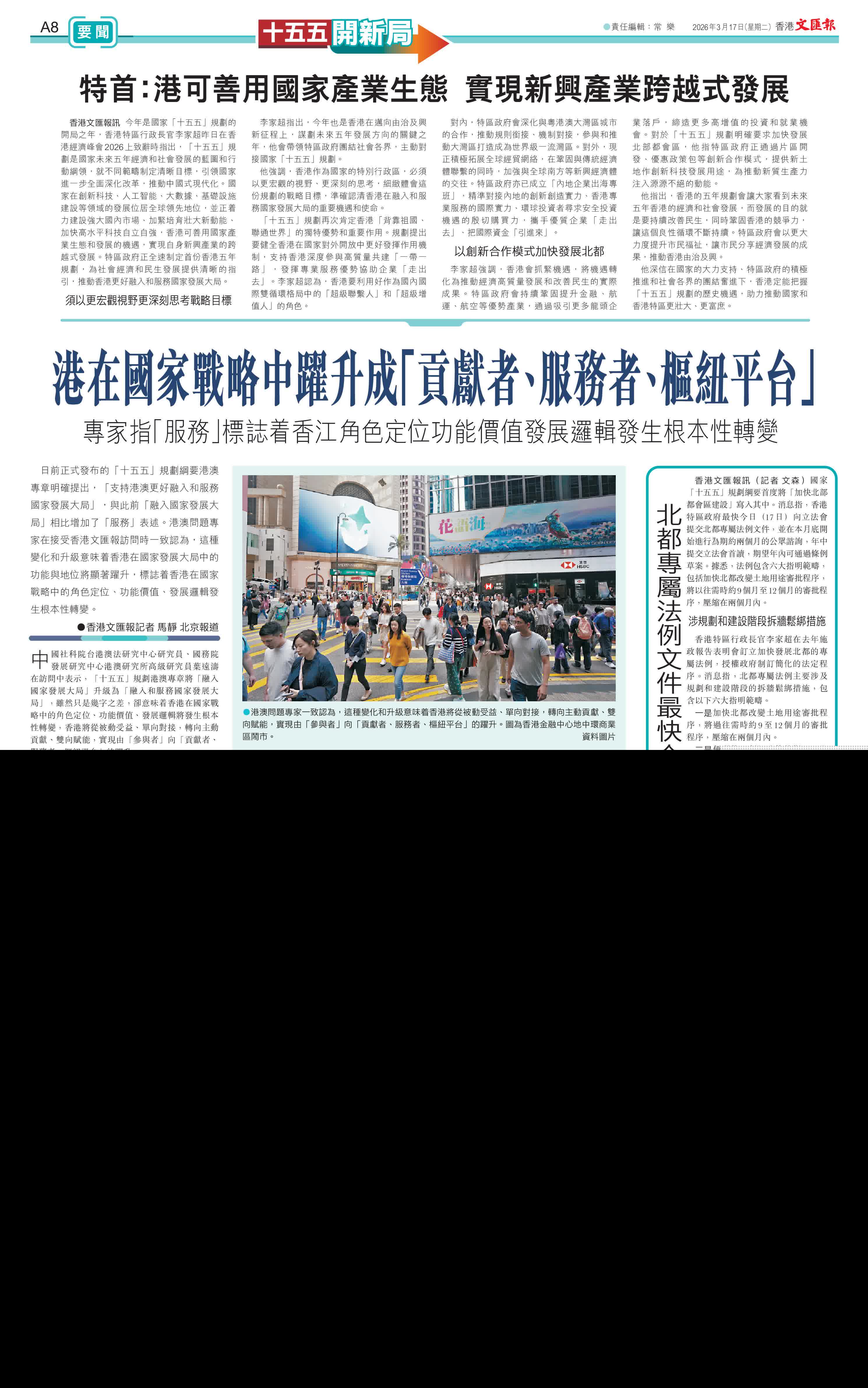 香港文匯報訊(記者 文森)國家「十五五」規劃綱要首度將「加快北部都會區建設」寫入其中。消息指,香港特區政府最快今日(17日)向立法會提交北都專屬法例文件,並在本月底開始進行為期約兩個月的公眾諮詢,年中提交立法會首讀,期望年內可通過條例草案。據悉,法例包含六大指明範疇,包括加快北都改變土地用途審批程序,將以往需時約9個月至12個月的審批程序,壓縮在兩個月內。