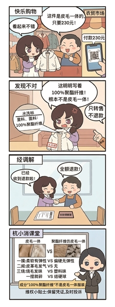 消费者在购物时,若产品标识信息不全,应标注而未标注,或者标注错误,如将聚酯纤维仿毛革制品标为“皮毛一体”,消费者可依据《中华人民共和国消费者权益保护法》要求退货退款。如若遇到消费纠纷,保留好购物小票、吊牌、宣传页面等凭证,先与商家沟通退换货事宜。如果协商不成,可以拨打12345便民服务热线,或向属地市场监管部门现场投诉;也可向属地消保委反映。(记者 毛雨希 通讯员 杭小消 制图 裘昀)