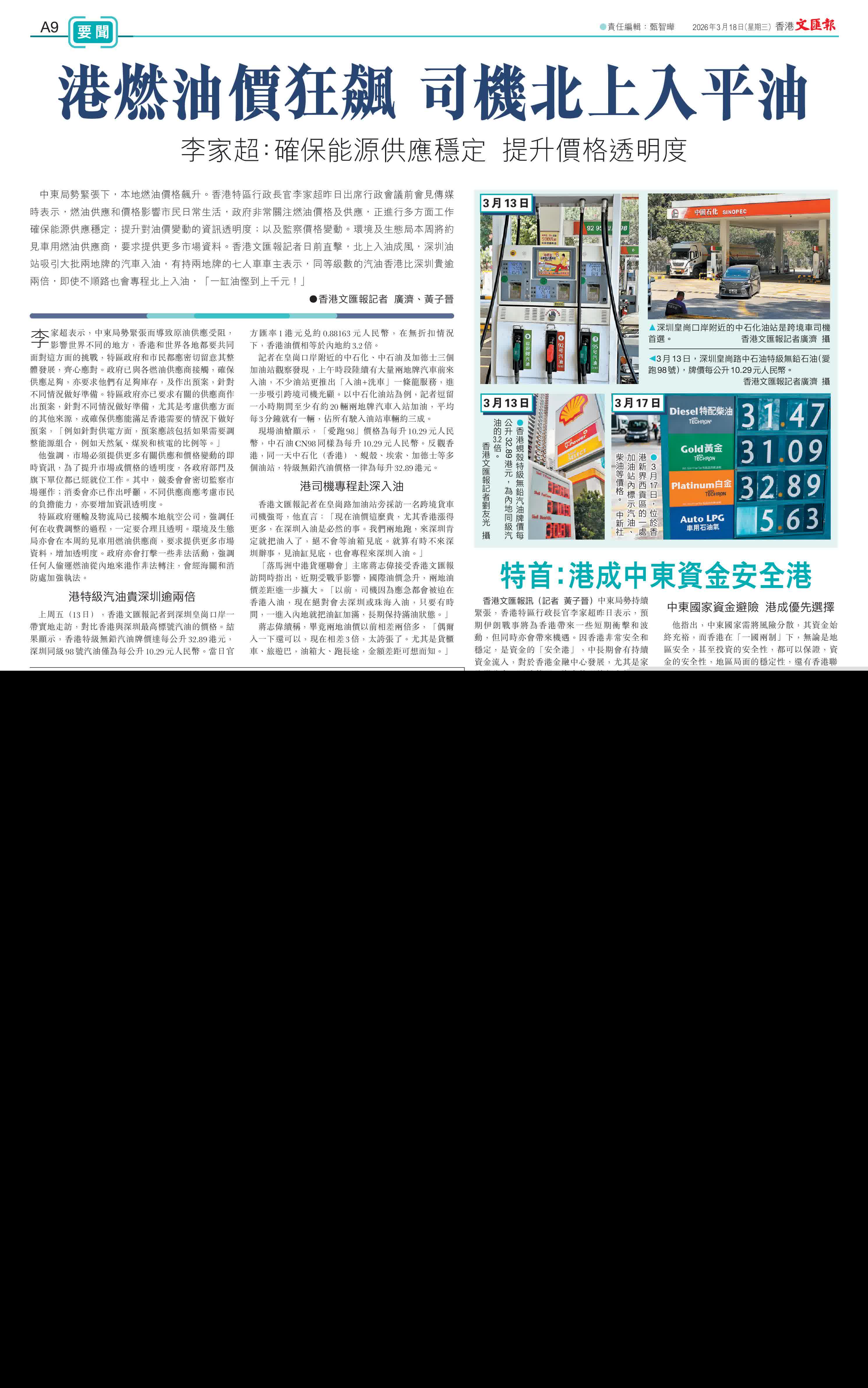 (香港文匯報記者 廣濟、黃子晉)中東局勢緊張下,本地燃油價格飆升。香港特區行政長官李家超昨日出席行政會議前會見傳媒時表示,燃油供應和價格影響市民日常生活,政府非常關注燃油價格及供應,正進行多方面工作確保能源供應穩定;提升對油價變動的資訊透明度;以及監察價格變動。環境及生態局本周將約見車用燃油供應商,要求提供更多市場資料。香港文匯報記者日前直擊,北上入油成風,深圳油站吸引大批兩地牌的汽車入油,有持兩地牌的七人車車主表示,同等級數的汽油香港比深圳貴逾兩倍,即使不順路也會專程北上入油,「一缸油慳到上千元!」
