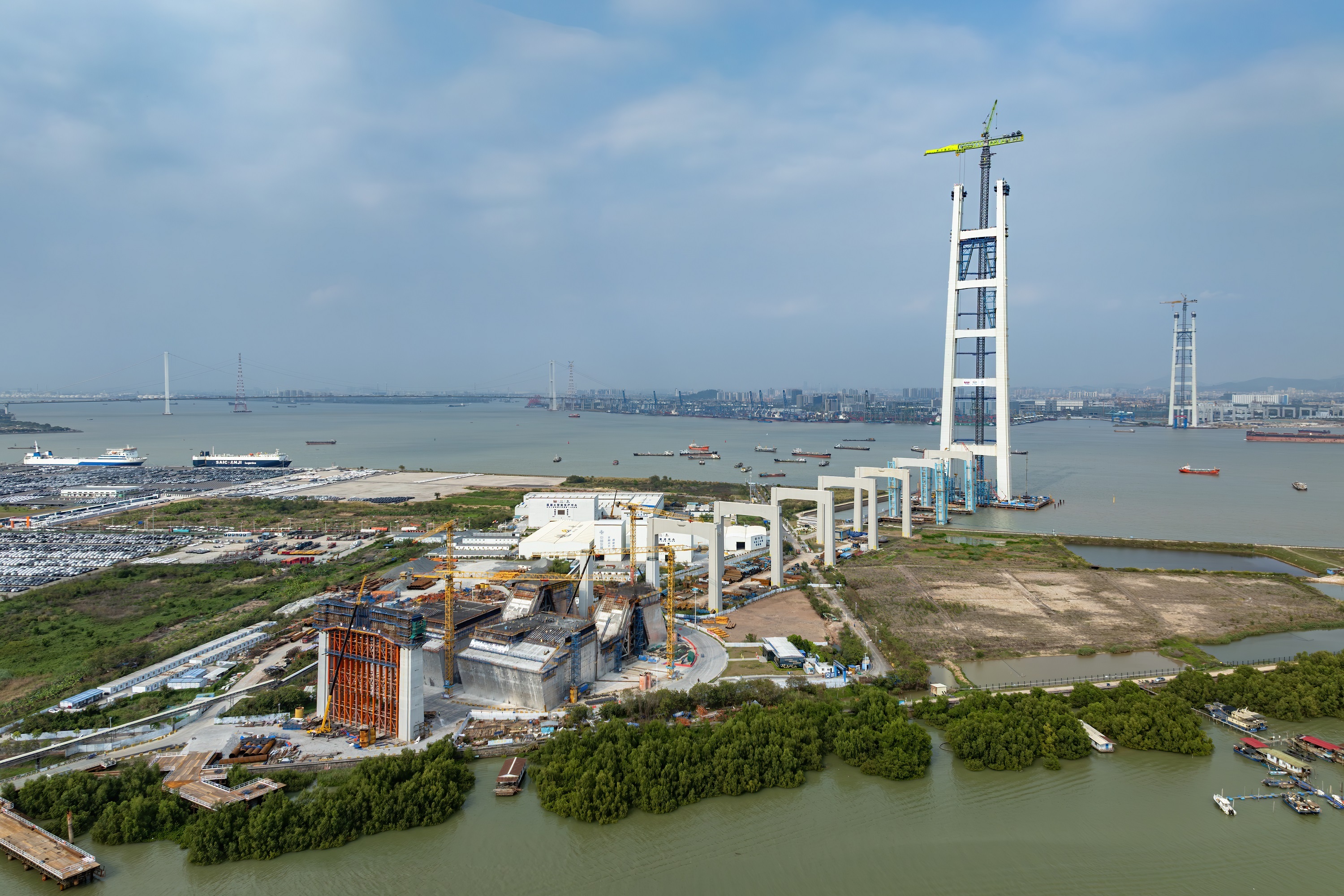 狮子洋大桥设东、西主塔,每座主塔高342米,相当于110层楼高,设6道横梁,单幅塔肢由62个巨型钢壳节段精准拼装。项目创新应用钢板-混凝土组合结构,显著减少塔身自重和提升结构稳定性。