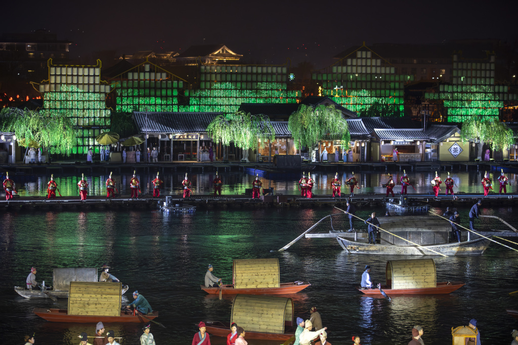 这创造了一个偌大的剧场。白天,游客能在街角邂逅“王员外抛绣球”,在广场围观“岳飞枪挑小梁王”,在水边看“水傀儡·哪吒闹海”。夜晚,景象全然不同。虹桥两岸灯火千点,蜿蜒如星河。亭台楼阁倒影摇曳。游人络绎,光影交错,恍然千年前的东京梦华。