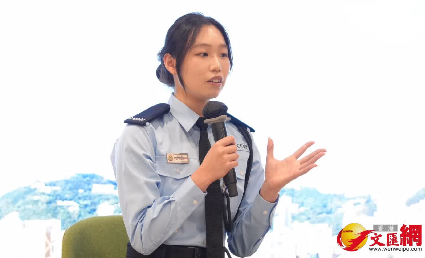 正在浸會大學就讀社會學學士課程三年級的歐天穎,從小夢想成為警察,因為在她眼中,警察守護着無數家庭的平安與喜樂,「我有考慮畢業後正式投考警隊,所以希望先加入輔警,更深入了解警務工作。」她認為,警察的工作不單是執法,更要有同理心,時刻抱持耐心去傾聽與市民溝通,例如在處理青少年問題時,能夠在過程中給予適當的引導,協助年輕人重新建立正確的價值觀,「我會以此為目標,為守護香港出一分力。」