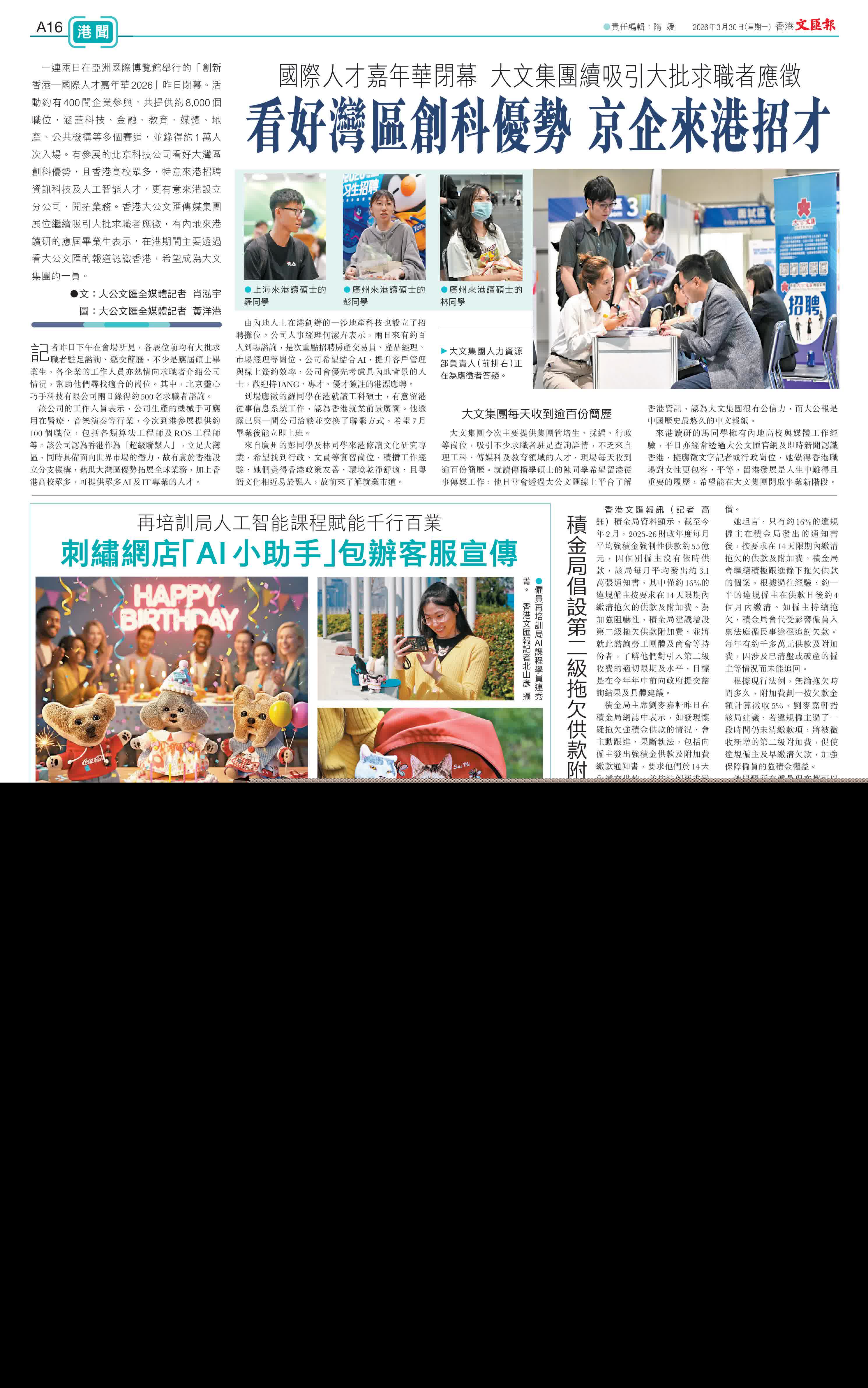 (文:大公文匯全媒體記者 肖泓宇 圖:大公文匯全媒體記者 黃洋港)一連兩日在亞洲國際博覽館舉行的「創新香港─國際人才嘉年華2026」昨日閉幕。活動約有400間企業參與,共提供約8,000個職位,涵蓋科技、金融、教育、媒體、地產、公共機構等多個賽道,並錄得約1萬人次入場。有參展的北京科技公司看好大灣區創科優勢,且香港高校眾多,特意來港招聘資訊科技及人工智能人才,更有意來港設立分公司,開拓業務。香港大公文匯傳媒集團展位繼續吸引大批求職者應徵,有內地來港讀研的應屆畢業生表示,在港期間主要透過看大公文匯的報道認識香港,希望成為大文集團的一員。