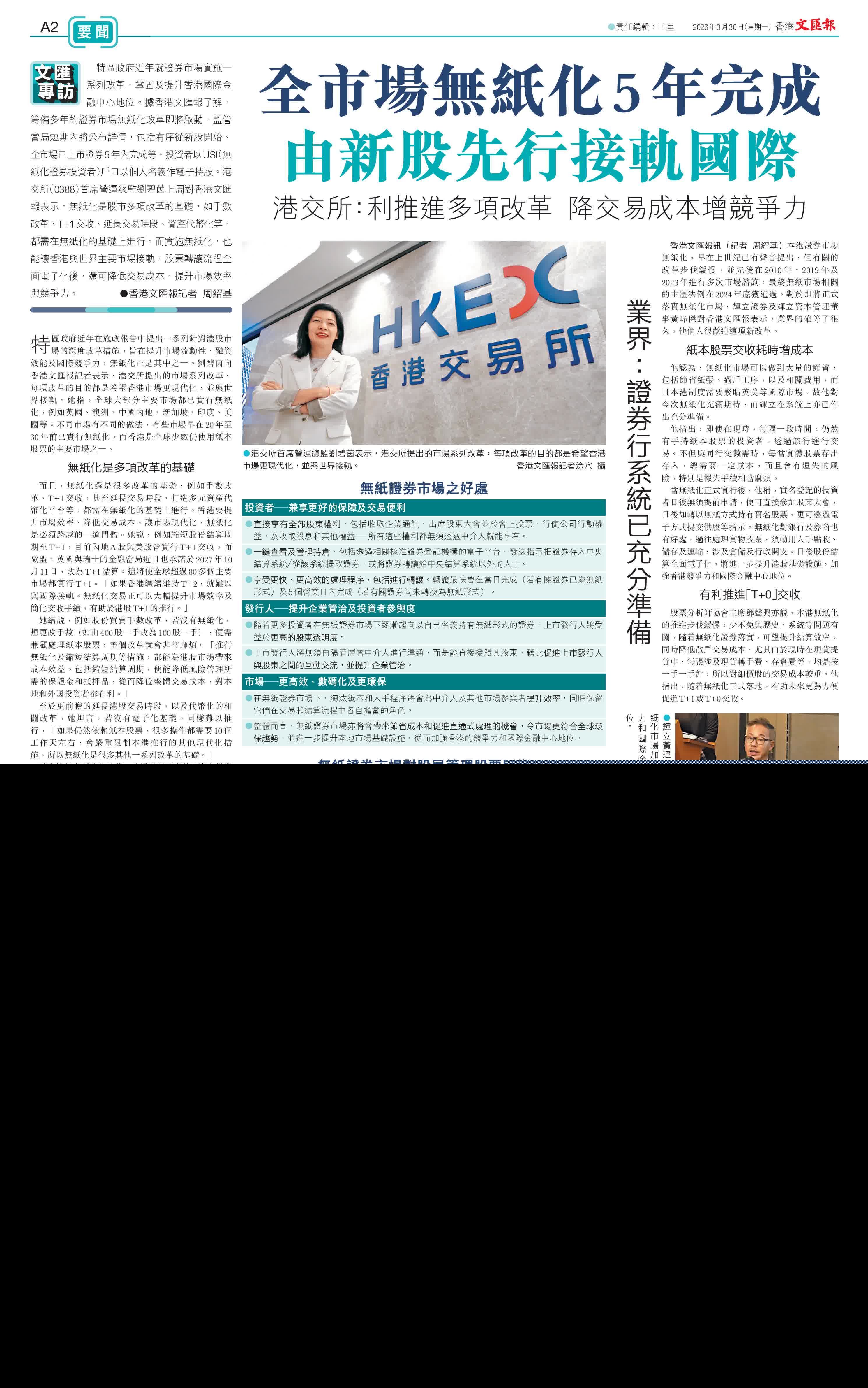 她續說,例如股份買賣手數改革,若沒有無紙化,想更改手數(如由400股一手改為100股一手),便需兼顧處理紙本股票,整個改革就會非常麻煩。「推行無紙化及縮短結算周期等措施,都能為港股市場帶來成本效益。包括縮短結算周期,便能降低風險管理所需的保證金和抵押品,從而降低整體交易成本,對本地和外國投資者都有利。」