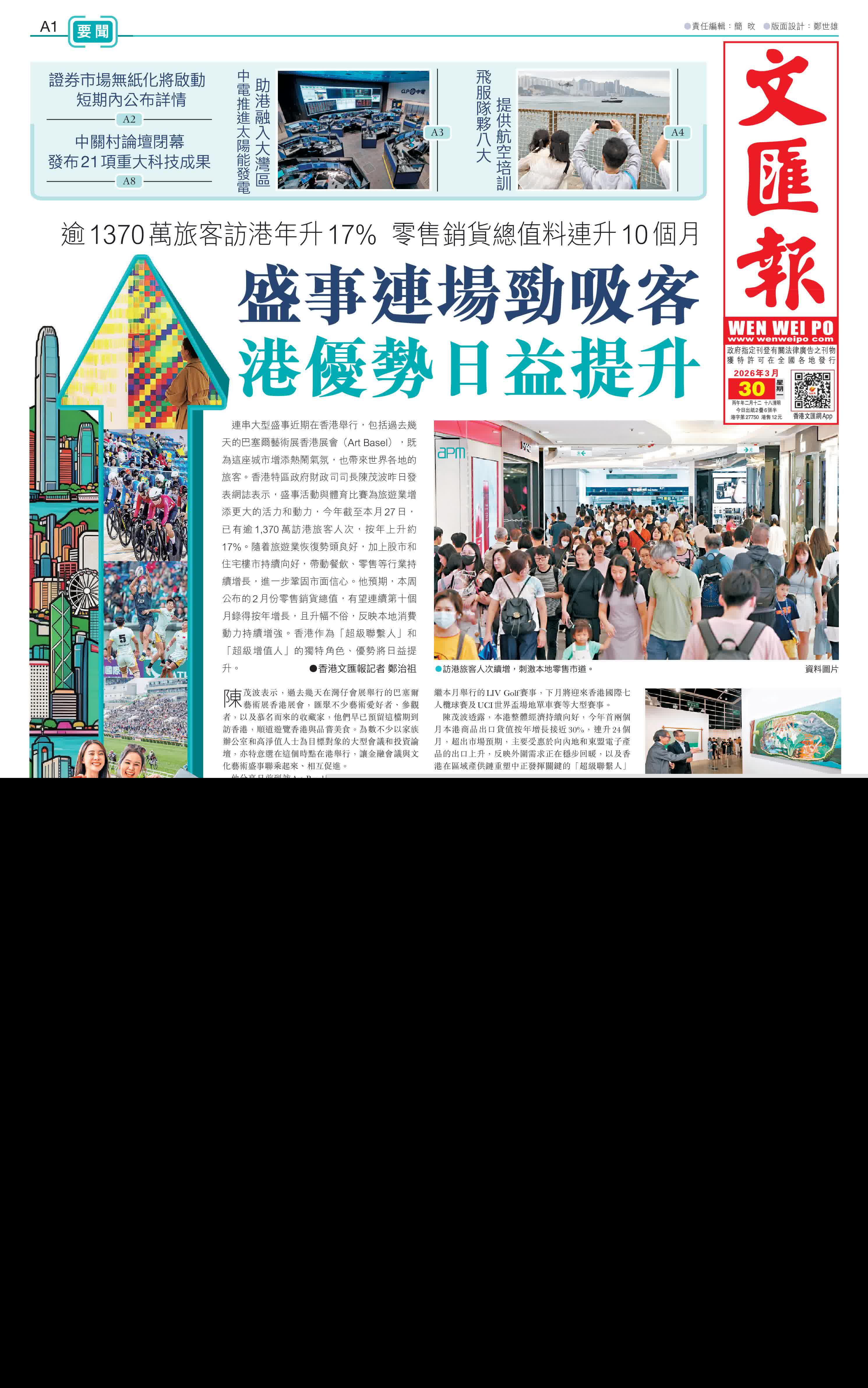 (香港文匯報記者 鄭治祖)連串大型盛事近期在香港舉行,包括過去幾天的巴塞爾藝術展香港展會(Art Basel),既為這座城市增添熱鬧氣氛,也帶來世界各地的旅客。香港特區政府財政司司長陳茂波昨日發表網誌表示,盛事活動與體育比賽為旅遊業增添更大的活力和動力,今年截至本月27日,已有逾1,370萬訪港旅客人次,按年上升約17%。隨着旅遊業恢復勢頭良好,加上股市和住宅樓市持續向好,帶動餐飲、零售等行業持續增長,進一步鞏固市面信心。他預期,本周公布的2月份零售銷貨總值,有望連續第十個月錄得按年增長,且升幅不俗,反映本地消費動力持續增強。香港作為「超級聯繫人」和「超級增值人」的獨特角色、優勢將日益提升。