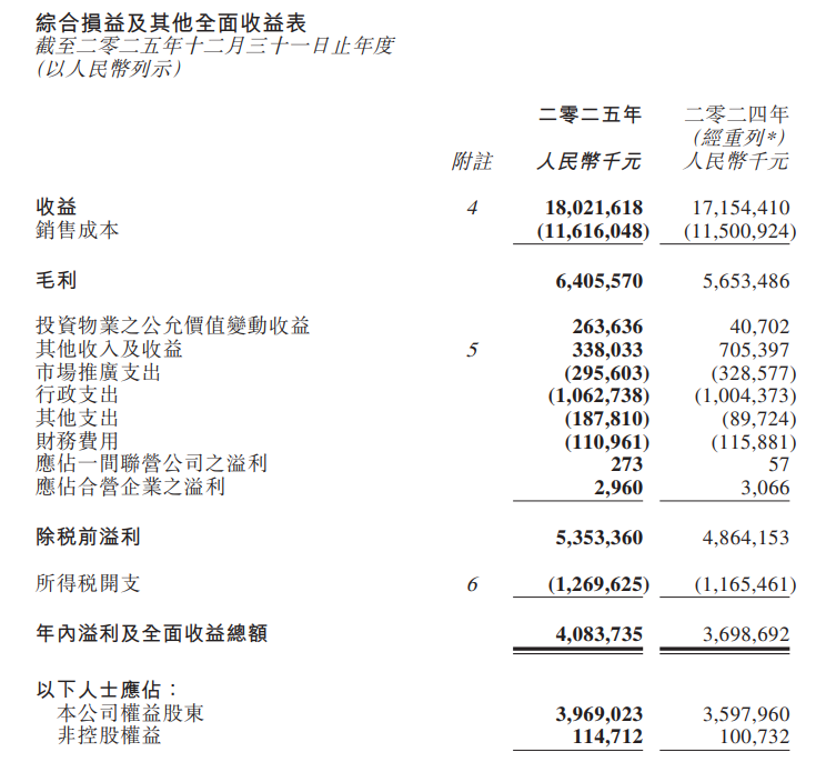 2025年,华润万象生活营业收入180.22亿元,同比增长5.1%;整体毛利率为35.5%,同比增加2.5个百分点;核心净利润为39.5亿元,同比增长13.7%。