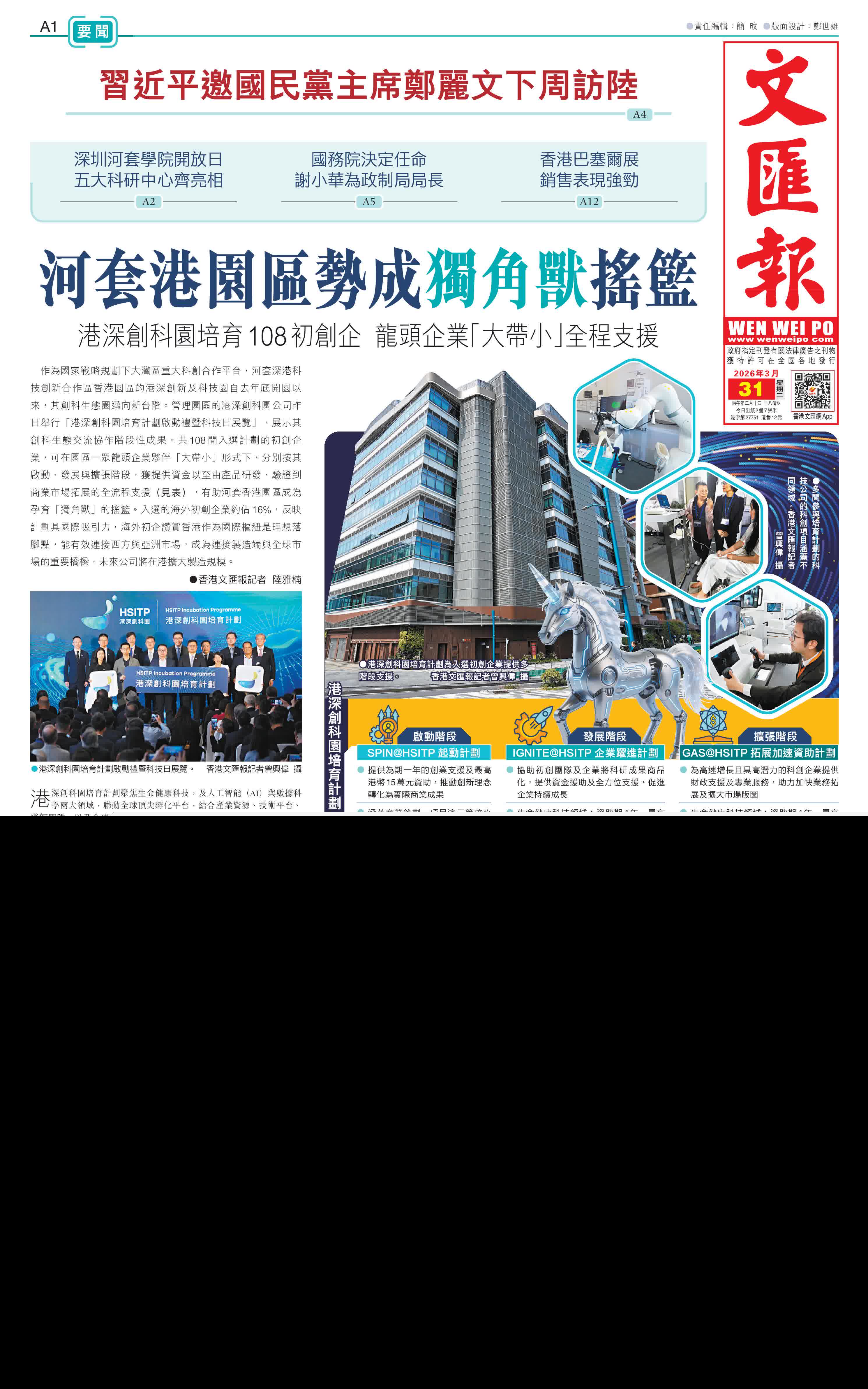 (香港文匯報記者 陸雅楠)作為國家戰略規劃下大灣區重大科創合作平台,河套深港科技創新合作區香港園區的港深創新及科技園自去年底開園以來,其創科生態圈邁向新台階。管理園區的港深創科園公司昨日舉行「港深創科園培育計劃啟動禮暨科技日展覽」,展示其創科生態交流協作階段性成果。共108間入選計劃的初創企業,可在園區一眾龍頭企業夥伴「大帶小」形式下,分別按其啟動、發展與擴張階段,獲提供資金以至由產品研發、驗證到商業市場拓展的全流程支援(見表),有助河套香港園區成為孕育「獨角獸」的搖籃。入選的海外初創企業約佔16%,反映計劃具國際吸引力,海外初企讚賞香港作為國際樞紐是理想落腳點,能有效連接西方與亞洲市場,成為連接製造端與全球市場的重要橋樑,未來公司將在港擴大製造規模。