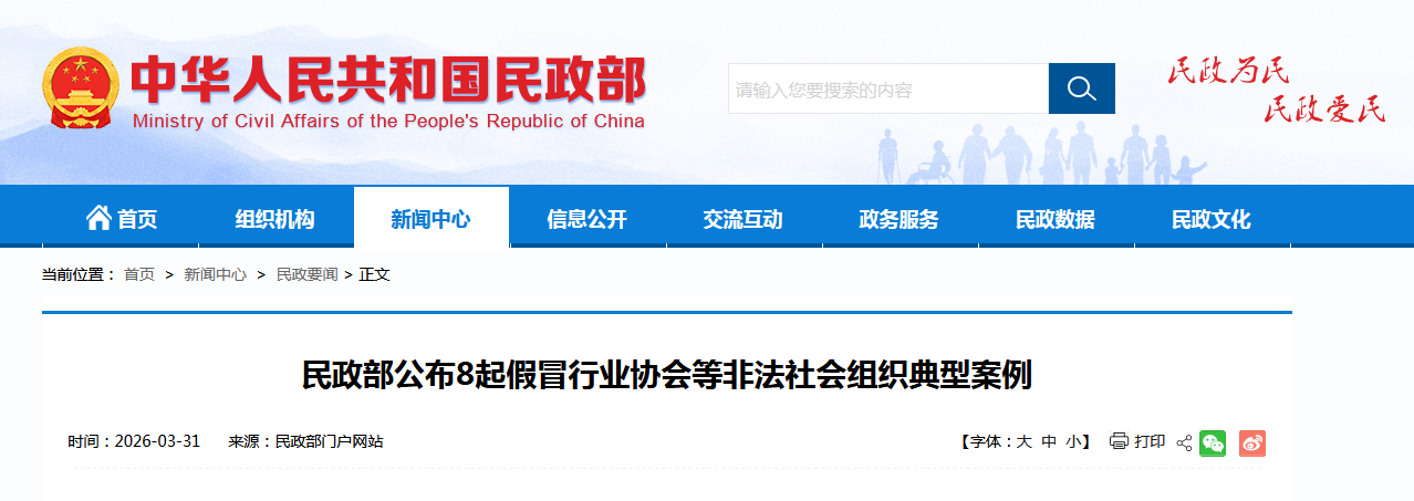 近年来,行业协会等社会组织聚焦服务党和国家工作大局,积极发挥自身优势,勇于创新探索,在反映行业诉求、协调利益关系、化解矛盾纠纷、开展建言献策、参与国际争端等方面发挥了积极作用。同时,一些未经登记、打着行业协会等旗号开展活动的非法社会组织,损害企业和人民群众合法权益,扰乱市场秩序,破坏社会组织登记管理秩序,侵蚀社会组织公信力。2025年以来,民政部坚决贯彻党中央、国务院决策部署,指导各级民政部门零容忍打击整治非法社会组织,依法处置了一批非法社会组织,有效防范化解了潜在的风险隐患,为经济社会健康发展贡献了民政力量。现选取地方民政部门依法查处的8起假冒行业协会等非法社会组织典型案例予以公布。同时,提醒有关机构和社会公众,在与社会组织开展合作或参与其活动时,可通过“中国社会组织政务服务平台”(https://chinanpo.mca.gov.cn)、“中国社会组织动态”政务微信(微信号:chinanpogov)核实其身份;发现非法社会组织活动线索的,请及时向属地民政部门举报。