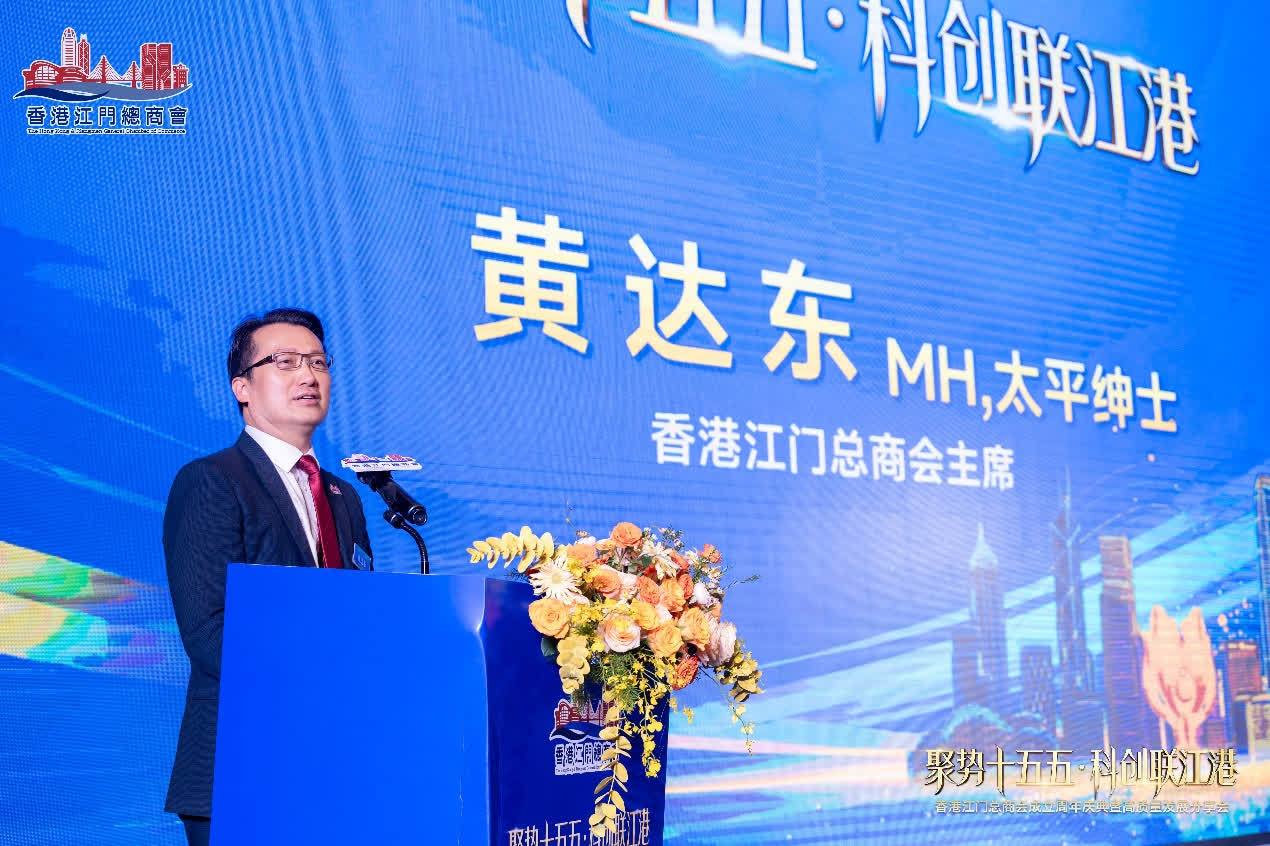 周年慶晚宴香港江門總商會主席黃達東MH、太平紳士簡要致辭,回顧商會一周年發展成果,明確未來將緊抓國家「十五五」規劃機遇,依託香港優勢對接江門產業與僑鄉資源,全力推動兩地經貿、科創等領域深度合作,踐行商會橋樑紐帶職責。