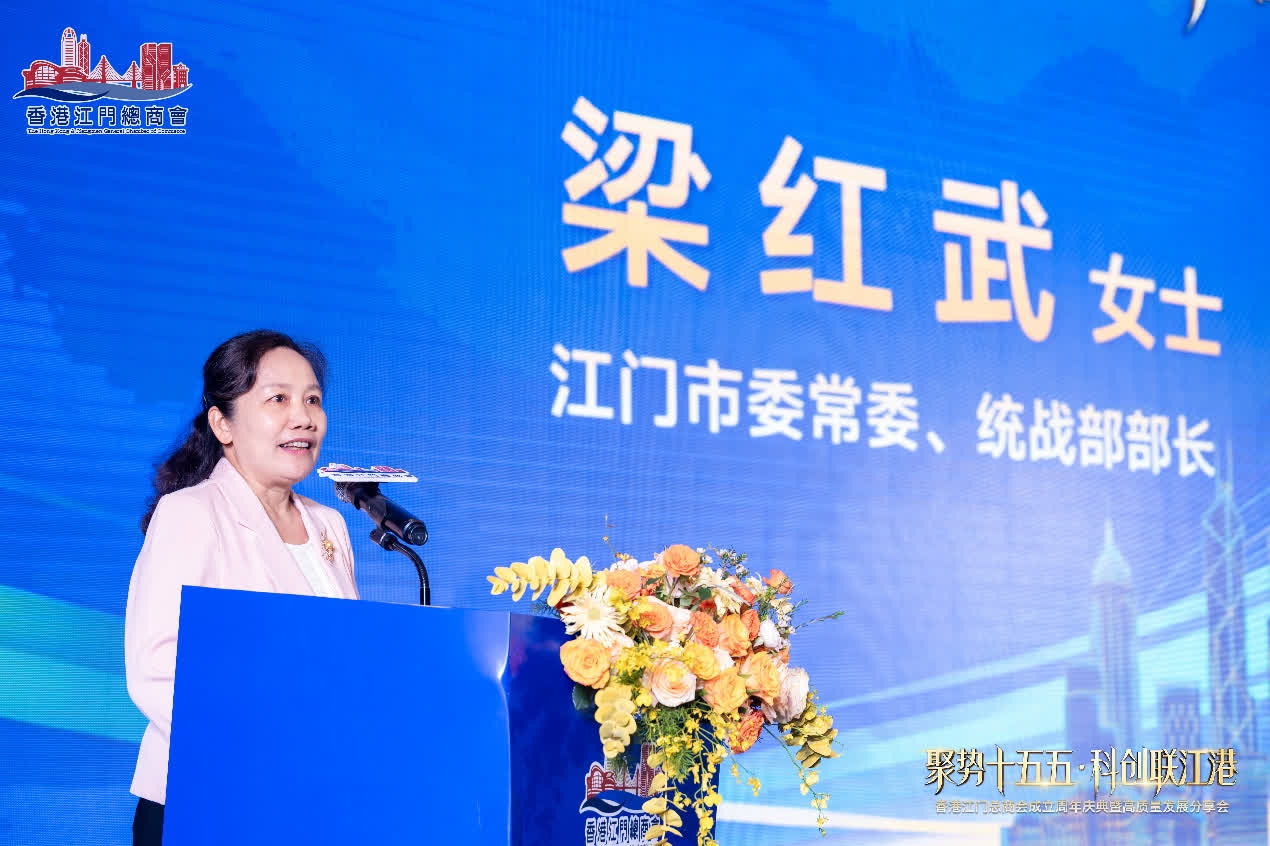 江門市委常委、統戰部部長梁紅武代表江門市委、市政府,向香港江門總商會成立一周年致以熱烈祝賀。梁紅武常委指出,當前江門正緊緊圍繞「拚經濟」工作主線,大力推進「大招商、招大商」,全力構建「13158」現代化產業體系,發展勢頭強勁、機遇無限。她充分肯定黃達東主席帶領下香港江門總商會成立以來工作表現,在促進江港兩地交流合作中發揮的重要橋樑紐帶作用,並對商會未來發展寄予殷切期望,希望商會全體同仁繼續當好兩地合作共贏的推動者,充分發揮香港在金融、科創、人才、商貿等方面的優勢,實現與江門產業、僑鄉資源的精準對接,全力推動「香港總部+江門基地」「香港研發+江門轉化」合作模式落地見效,助力江門深度融入粵港澳大灣區建設,推動江港兩地合作邁向更高水準、收穫更多成果。