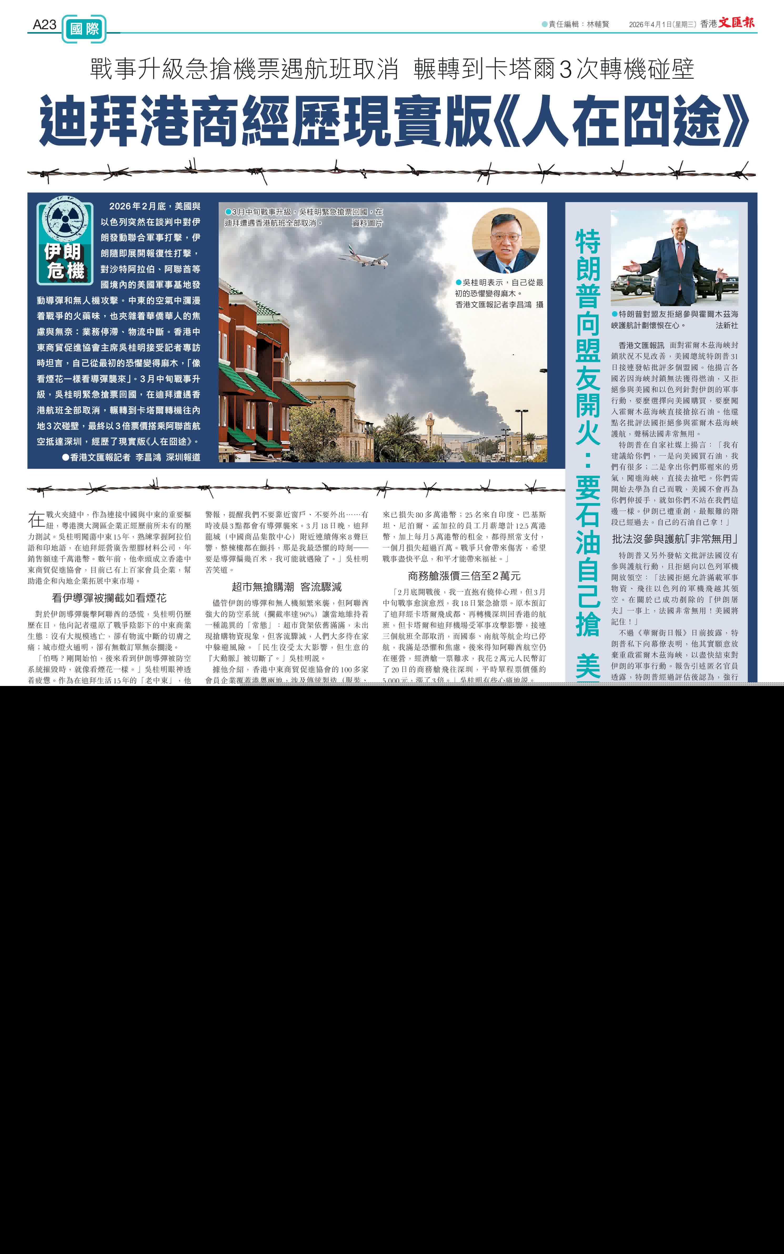 「2月底開戰後,我一直抱有僥倖心理,但3月中旬戰事愈演愈烈,我18日緊急搶票。原本預訂了迪拜經卡塔爾飛成都、再轉機深圳回香港的航班,但卡塔爾和迪拜機場受軍事攻擊影響,接連三個航班全部取消,而國泰、南航等航企均已停航,我滿是恐懼和焦慮。後來得知阿聯酋航空仍在運營,經濟艙一票難求,我花2萬元人民幣訂了20日的商務艙飛往深圳,平時單程票價僅約5,000元,漲了3倍。」吳桂明有些心痛地說。