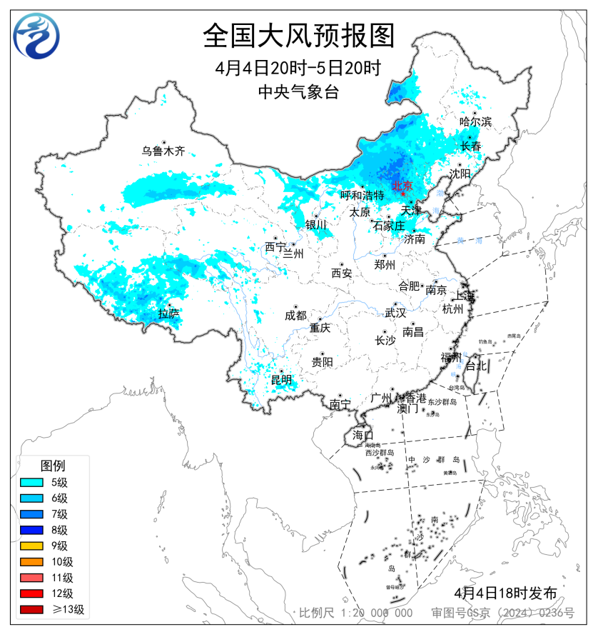 预计,4月5日20时至6日20时,内蒙古中东部、山西北部、京津冀北部、辽宁西部和北部、吉林南部、黑龙江西部、新疆东部、甘肃西部、青海南部、西藏中西部、川西高原、云南南部等地部分地区有5~7级风,阵风7~9级。东海东部部分海域将有7~8级、阵风9级的大风。