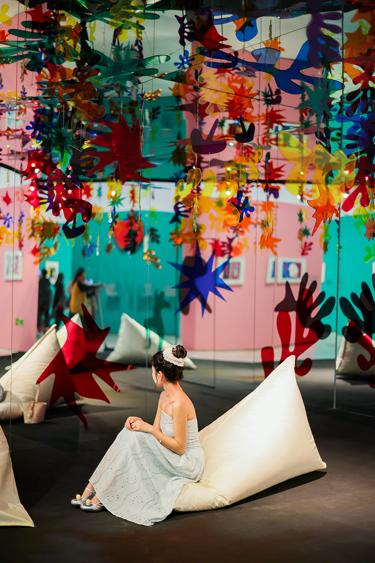 为打破艺术与大众的壁垒,展览精心设置了11处沉浸式打卡点与互动体验区。在蓝白雕塑展陈旁,在《舞蹈》整墙彩色灯光装置前、在镜面安乐椅躺平区中、无论是情侣约会、闺蜜打卡,还是亲子遛娃、独处放空,都能沉浸式感受色彩的激情与活力,轻松拍出刷爆朋友圈的艺术大片。