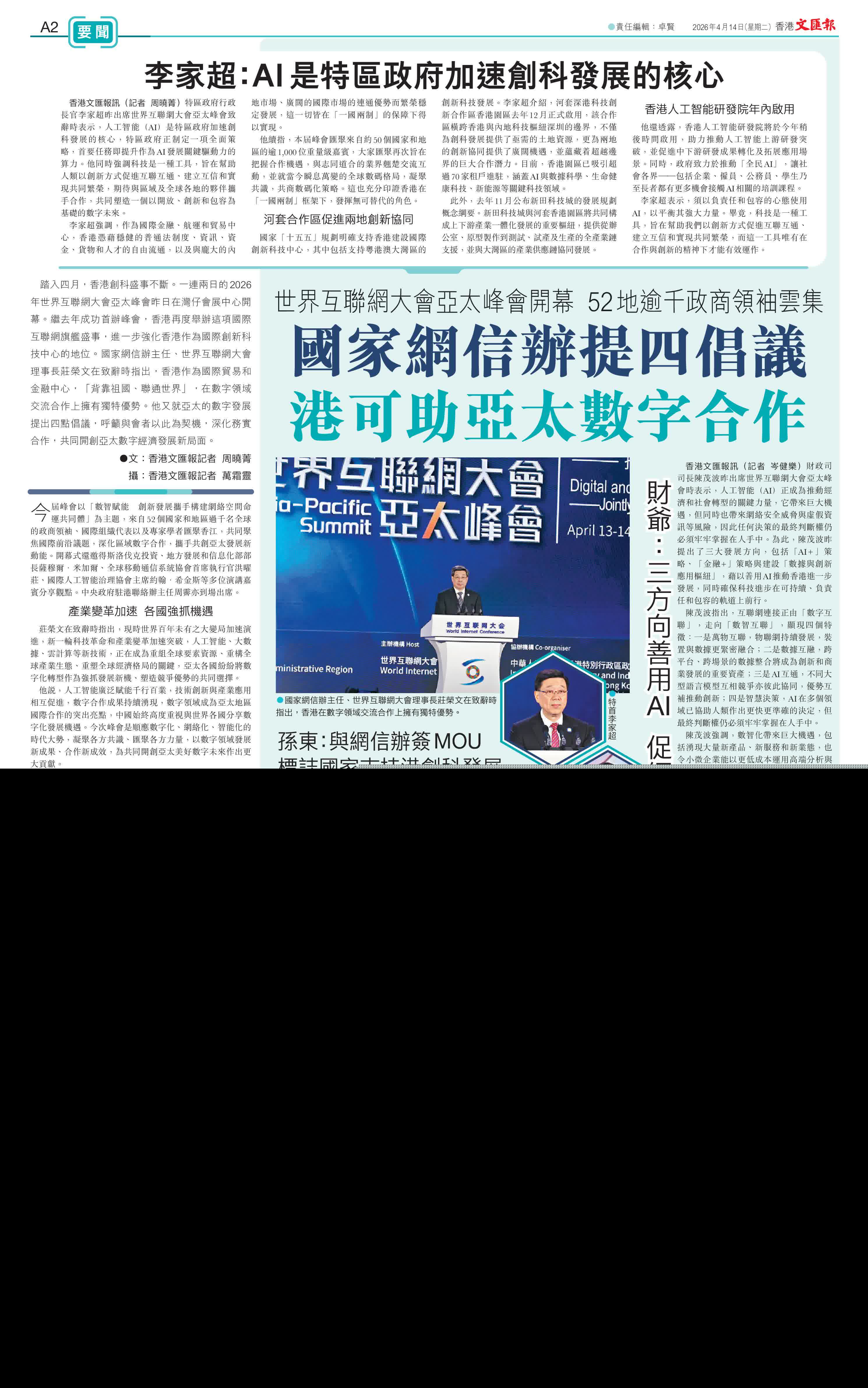 (香港文匯報記者 周曉菁)踏入四月,香港創科盛事不斷。一連兩日的2026年世界互聯網大會亞太峰會昨日在灣仔會展中心開幕。繼去年成功首辦峰會,香港再度舉辦這項國際互聯網旗艦盛事,進一步強化香港作為國際創新科技中心的地位。國家網信辦主任、世界互聯網大會理事長莊榮文在致辭時指出,香港作為國際貿易和金融中心,「背靠祖國、聯通世界」,在數字領域交流合作上擁有獨特優勢。他又就亞太的數字發展提出四點倡議,呼籲與會者以此為契機,深化務實合作,共同開創亞太數字經濟發展新局面。