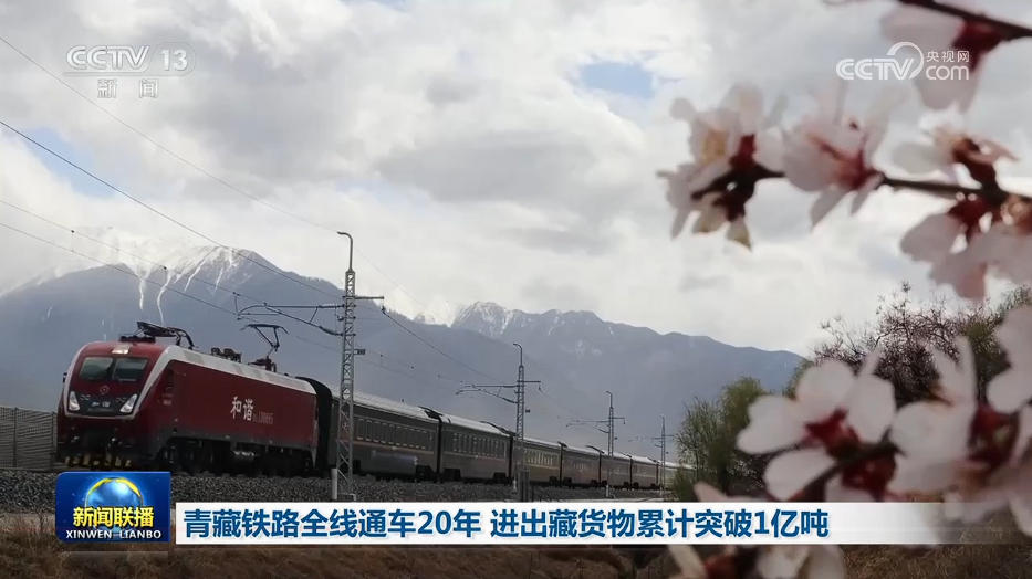 央视网消息(新闻联播):记者从中国铁路青藏集团有限公司获悉,青藏铁路全线通车运营20年来,进出藏铁路货运量稳步增长。截至今年4月13日,通过青藏铁路运输进出藏货物总量累计突破1亿吨,进出藏旅客量突破4100万人次。