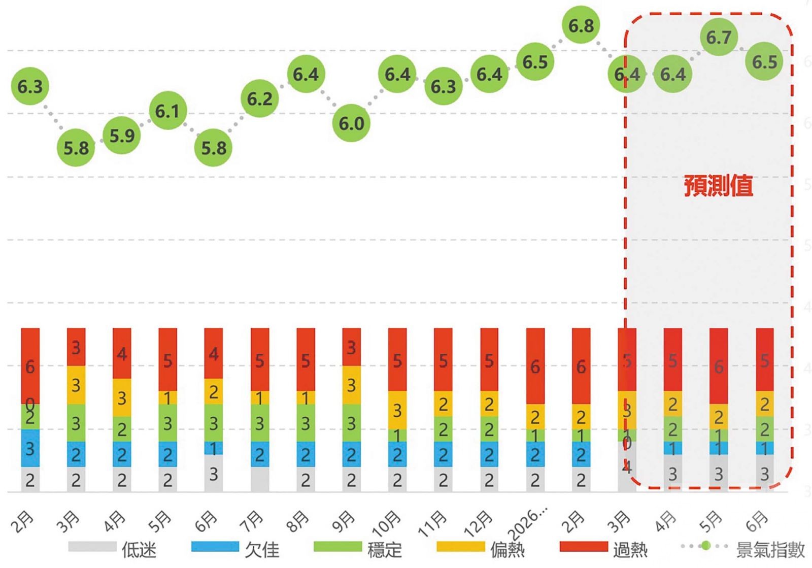 另一方面,反映內需與市場信心的指標仍顯得較為疲態。內地消費者信心雖略見回暖,整體仍處低位;本地居民貸存比持續下滑,資金轉化為信貸與投資的意願不足;同時,住宅價格指數及主要綜合旅遊休閒企業股價長期徘徊低位,反映資產市場修復乏力,亦拖慢整體信心回升。經綜合評估及推算,今年2、3月澳門經濟景氣指數處於「穩定」區間。
