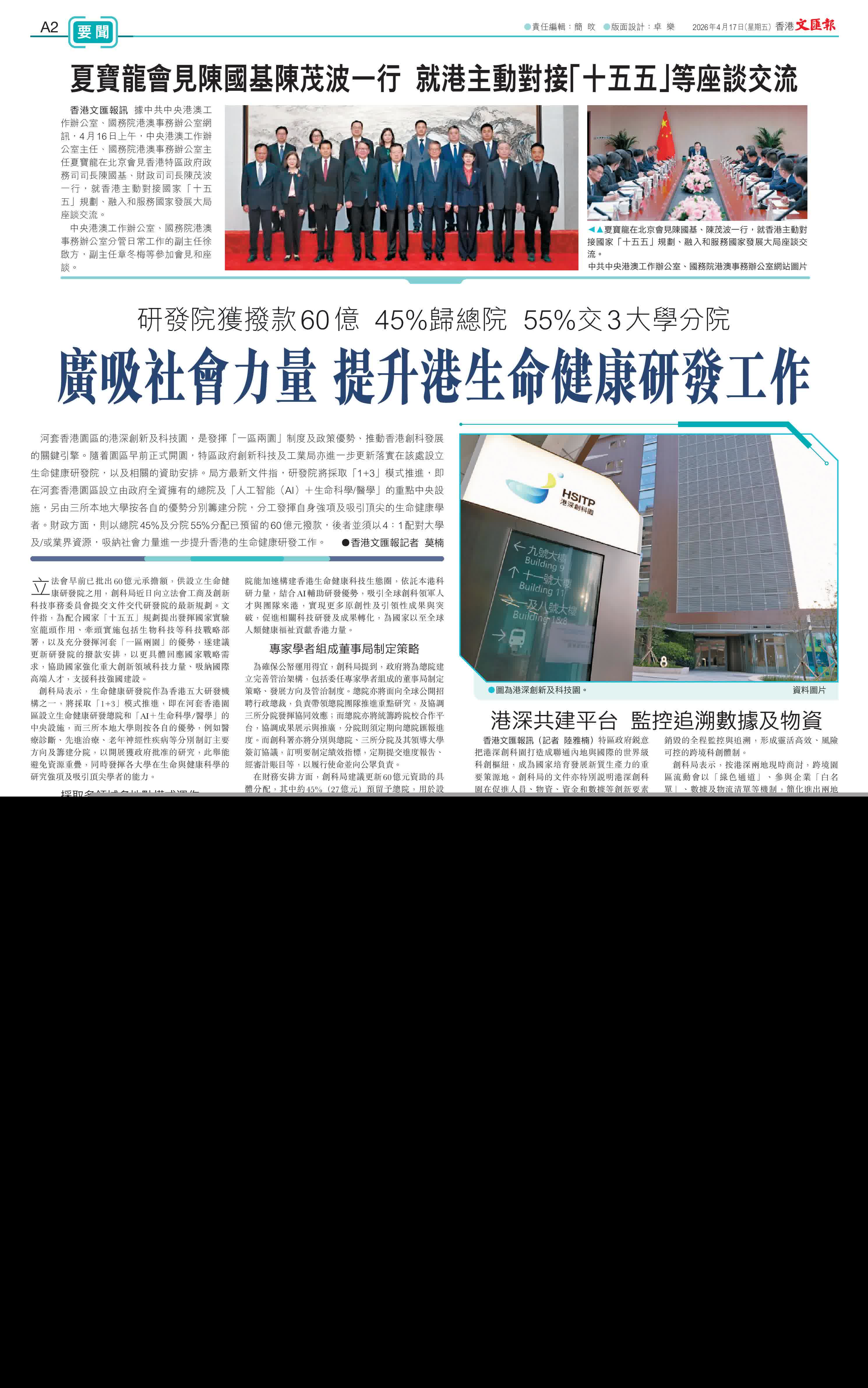 香港文匯報訊(記者 莫楠)河套香港園區的港深創新及科技園,是發揮「一區兩園」制度及政策優勢、推動香港創科發展的關鍵引擎。隨着園區早前正式開園,特區政府創新科技及工業局亦進一步更新落實在該處設立生命健康研發院,以及相關的資助安排。局方最新文件指,研發院將採取「1+3」模式推進,即在河套香港園區設立由政府全資擁有的總院及「人工智能(AI)+生命科學/醫學」的重點中央設施,另由三所本地大學按各自的優勢分別籌建分院,分工發揮自身強項及吸引頂尖的生命健康學者。財政方面,則以總院45%及分院55%分配已預留的60億元撥款,後者並須以4:1配對大學及/或業界資源,吸納社會力量進一步提升香港的生命健康研發工作。
