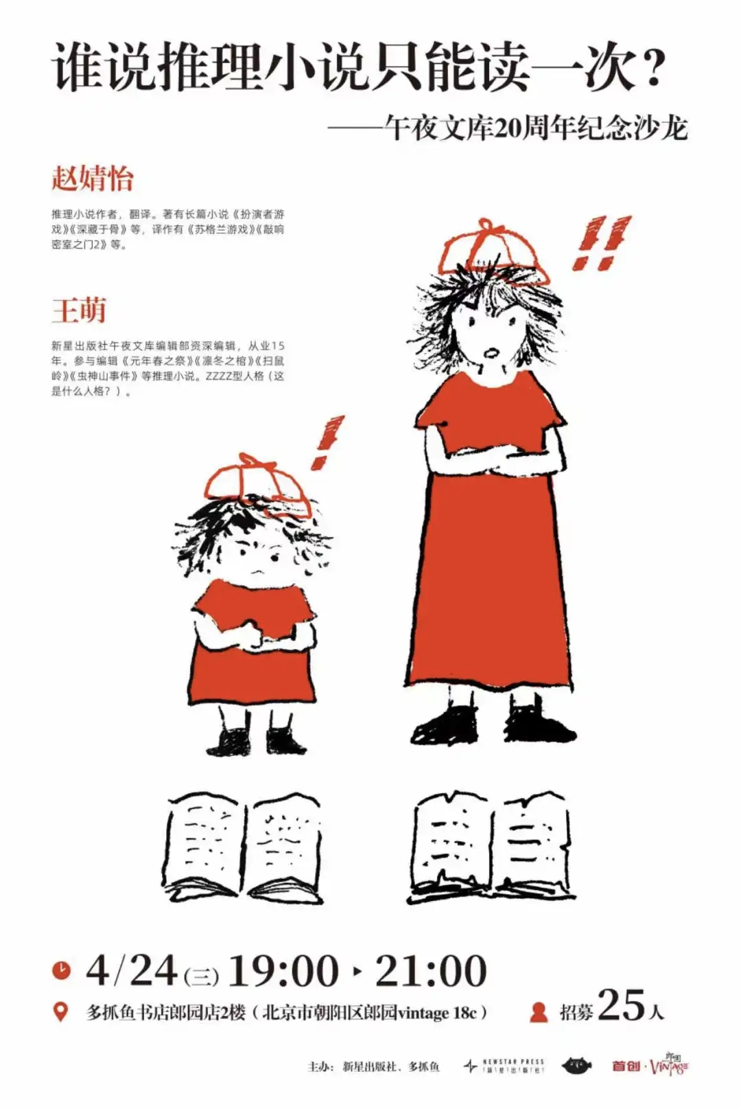 今年是中国外文局所属新星出版社午夜文库成立20周年。20年来,午夜文库一直致力于出版并宣传推理小说,推广推理文化。在新的全民阅读周到来之际,新星出版社联合“多抓鱼二手循环书店”,推出“侦探小说二手循环榜单”,并将在北京的多抓鱼书店进行区域展陈,分享一些午夜文库的孤品、珍贵版本。同时,新星出版社也将准备一场线下分享会,以“谁说推理小说只能读一次”为主题,与大家共同探讨侦探小说这一看似小众、实则趣味十足的小说流派的永恒魅力。
