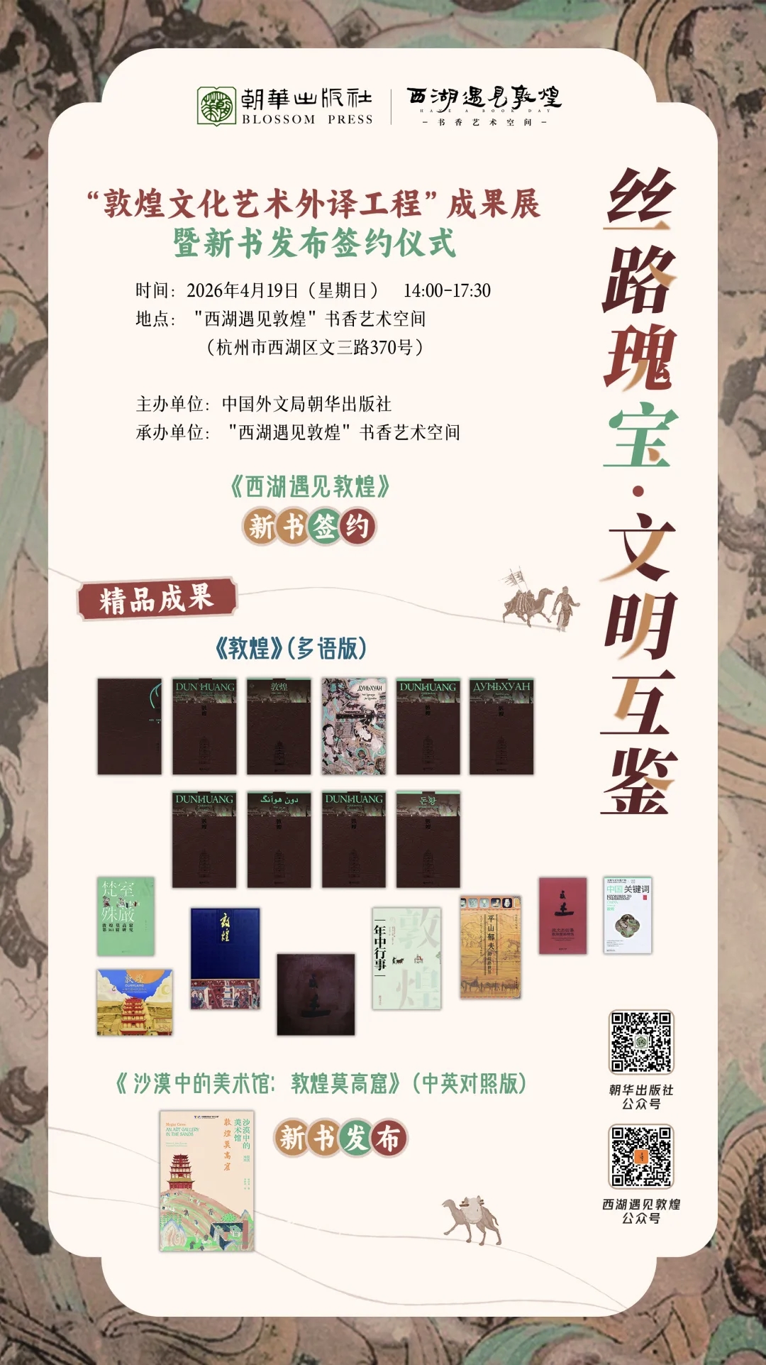 “敦煌文化艺术外译工程”由中国外文局所属朝华出版社发起。2018年启动至今,汇聚国内外一线作者和文化同业,推出一批优秀多语种图书产品,打造兼具知名度和国际传播影响力的精品出版品牌标识。朝华出版社此次联合杭州“西湖遇见敦煌”书香艺术空间,展示敦煌主题出版建设成果;携手业界名家友人,交流实践经验,展望合作拓展前景,共襄敦煌书香雅韵。