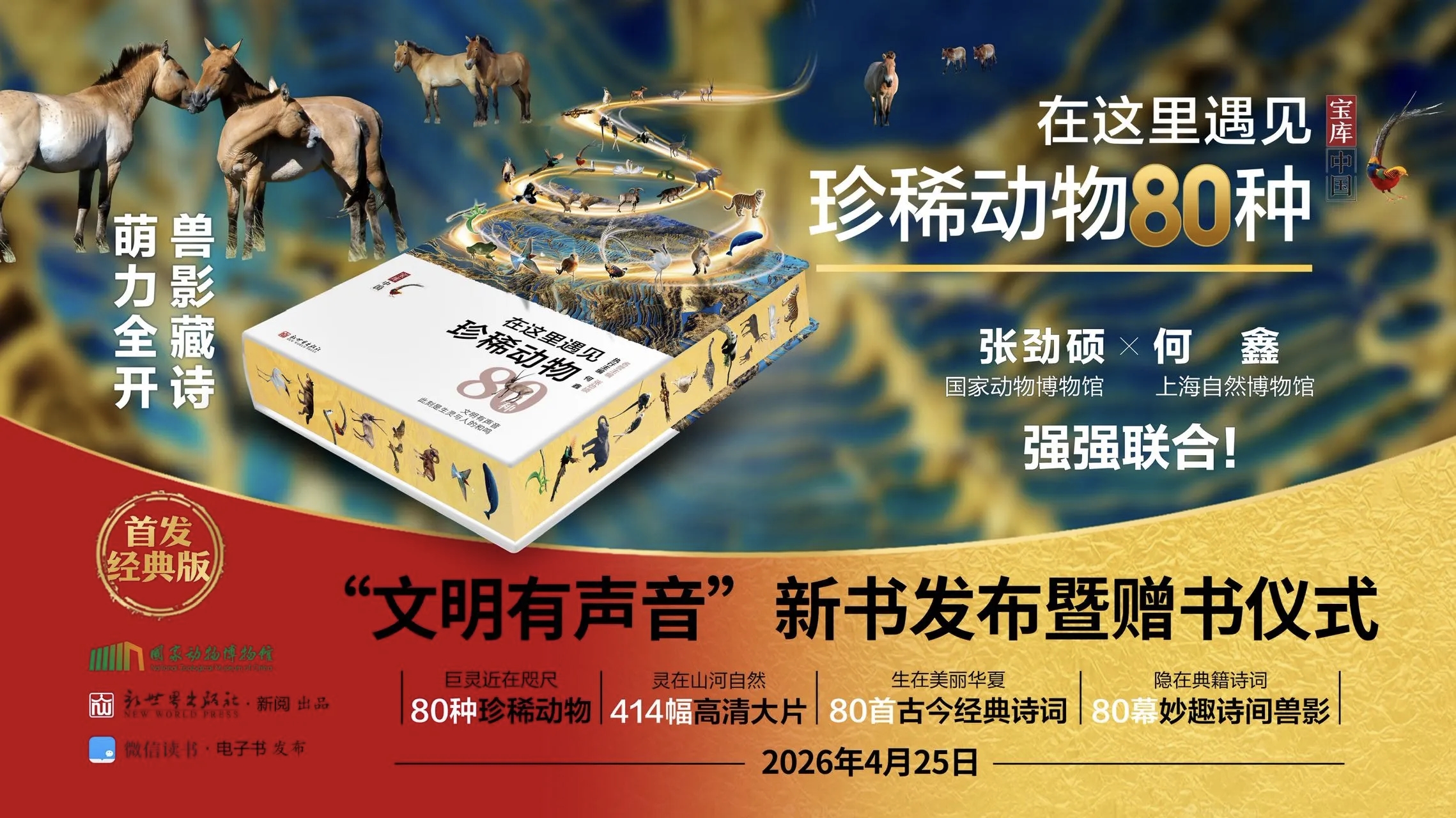 4月25日上午,国家动物博物馆与中国外文局所属新世界出版社将在中国科学院动物研究所联合举办《宝库中国:在这里遇见珍稀动物80种》新书分享与签售会。国家动物博物馆馆长、本书名誉主编张劲硕,上海自然博物馆何鑫将分享编创历程。科普环节由国家动物博物馆王传齐带来“宝库中国”之《诗语生灵》主题科普知识分享,王春法、郭义强、王志庚、尹峰等嘉宾将围绕“文明有声音,此刻是生灵与人的和鸣”展开点评。现场还将举行赠书、合影与签售活动。