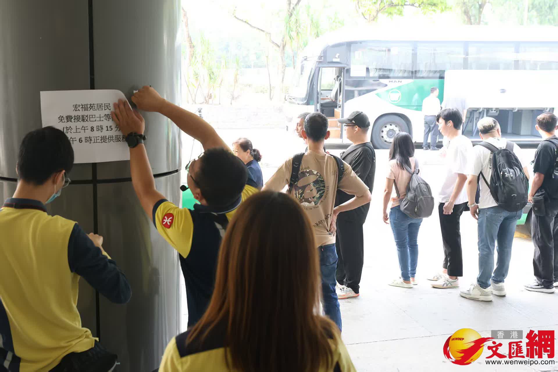香港文匯報(記者 須臾)大埔宏福苑7座樓宇居民今日(20日)起分批上樓執拾物品,首批上樓的是宏新閣居民。今早約8時半,有居民乘坐接駁巴士抵達,當中不少人拖着行李箱。他們隨後到廣福社區會堂登記中心登記,再安排上樓。