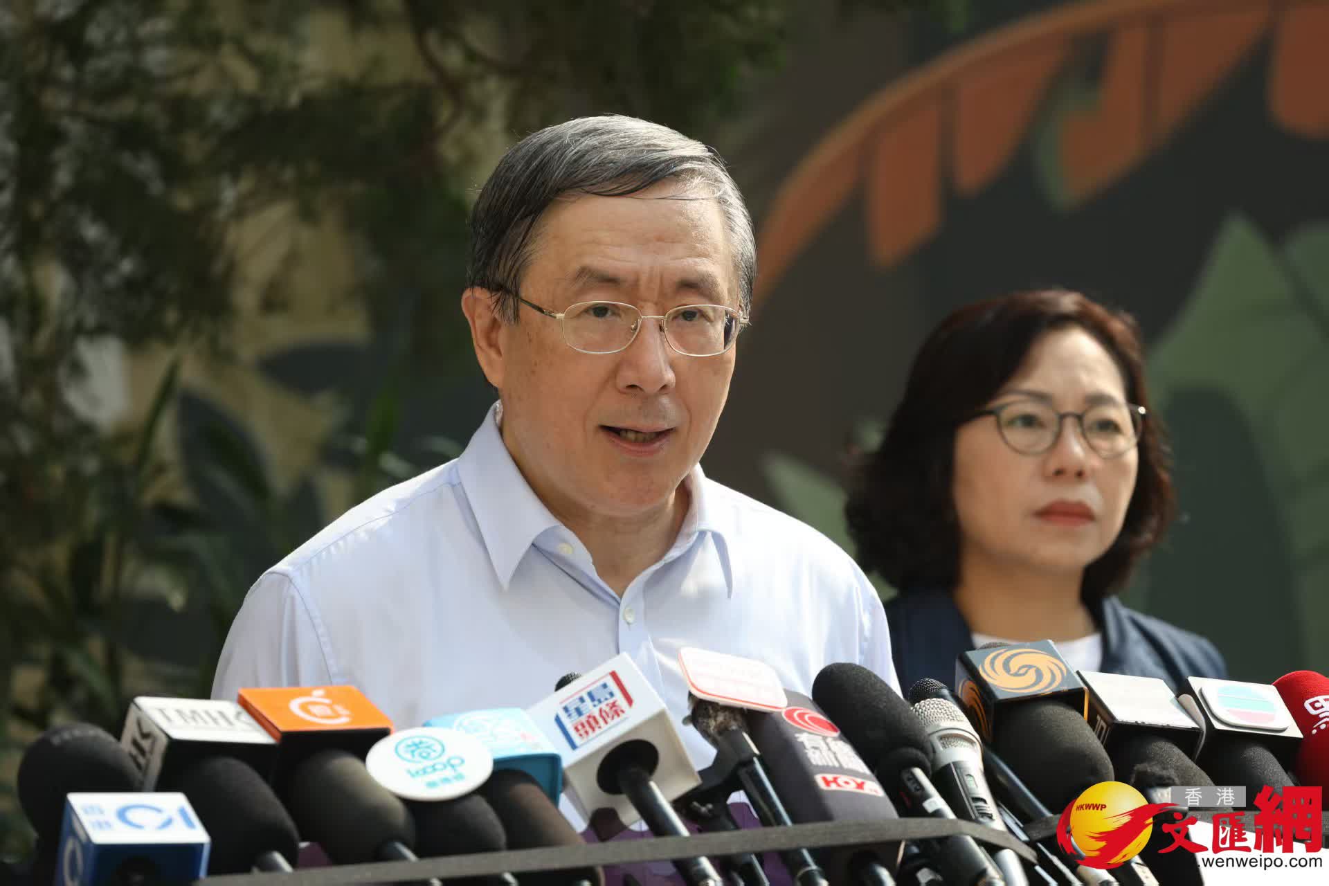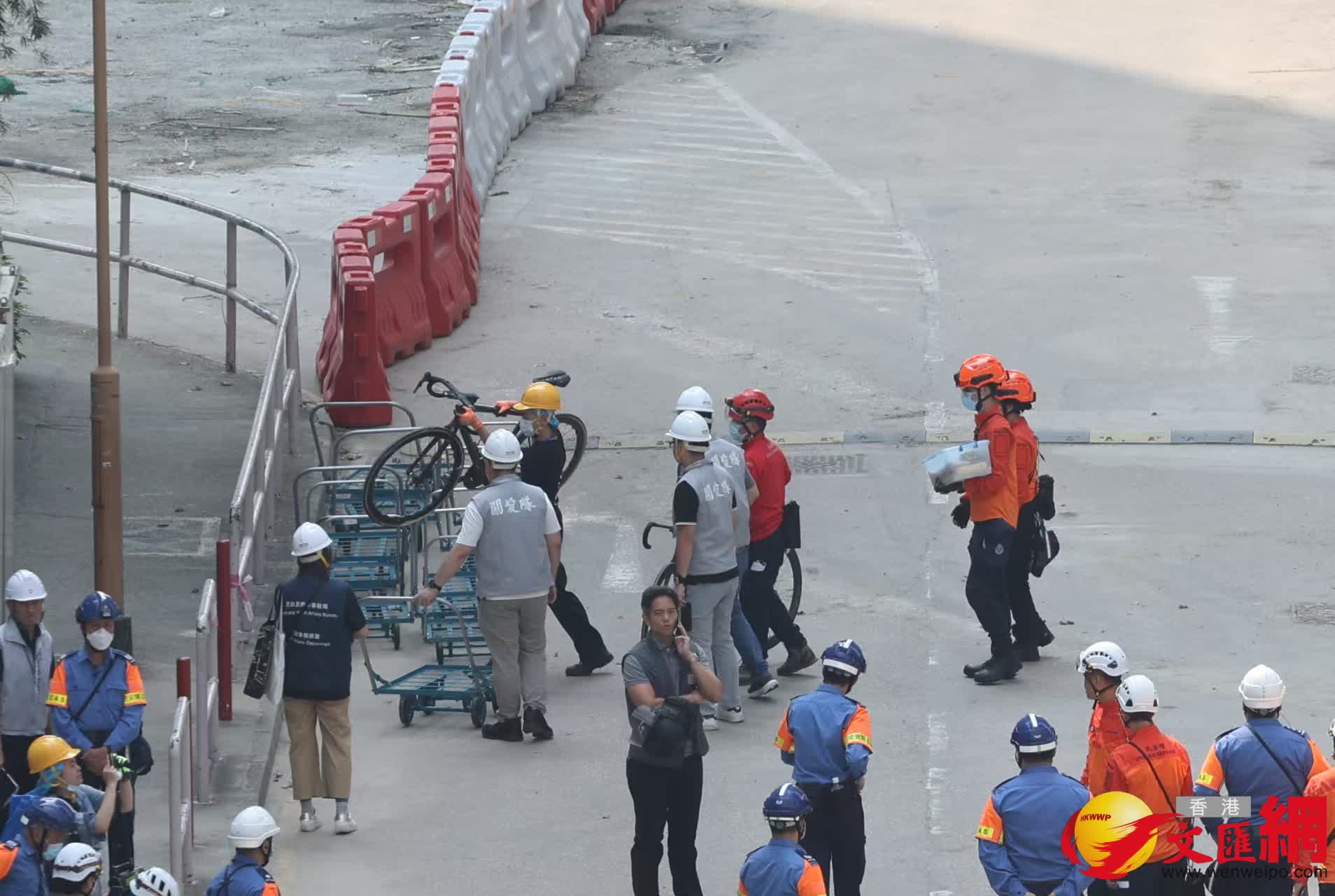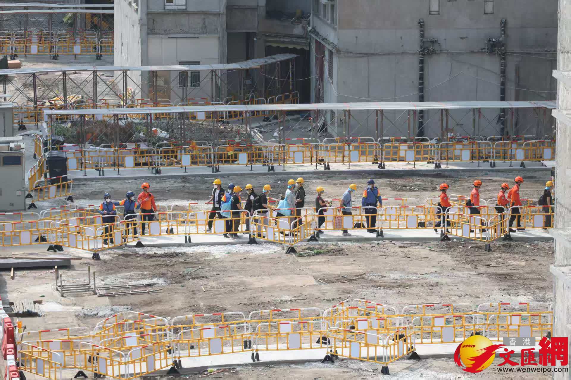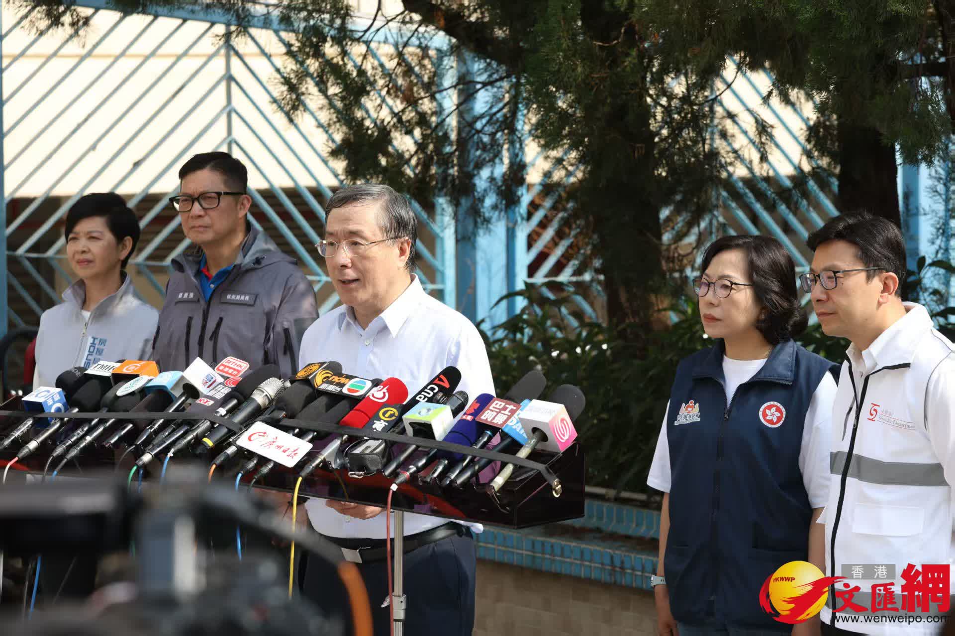 為上樓居民作登記手續的廣福社區會堂,政務司副司長卓永興聯同民青局局長麥美娟、保安局局長鄧炳強、房屋局局長何永賢及勞福局局長孫玉菡在宏福苑現場見記者。