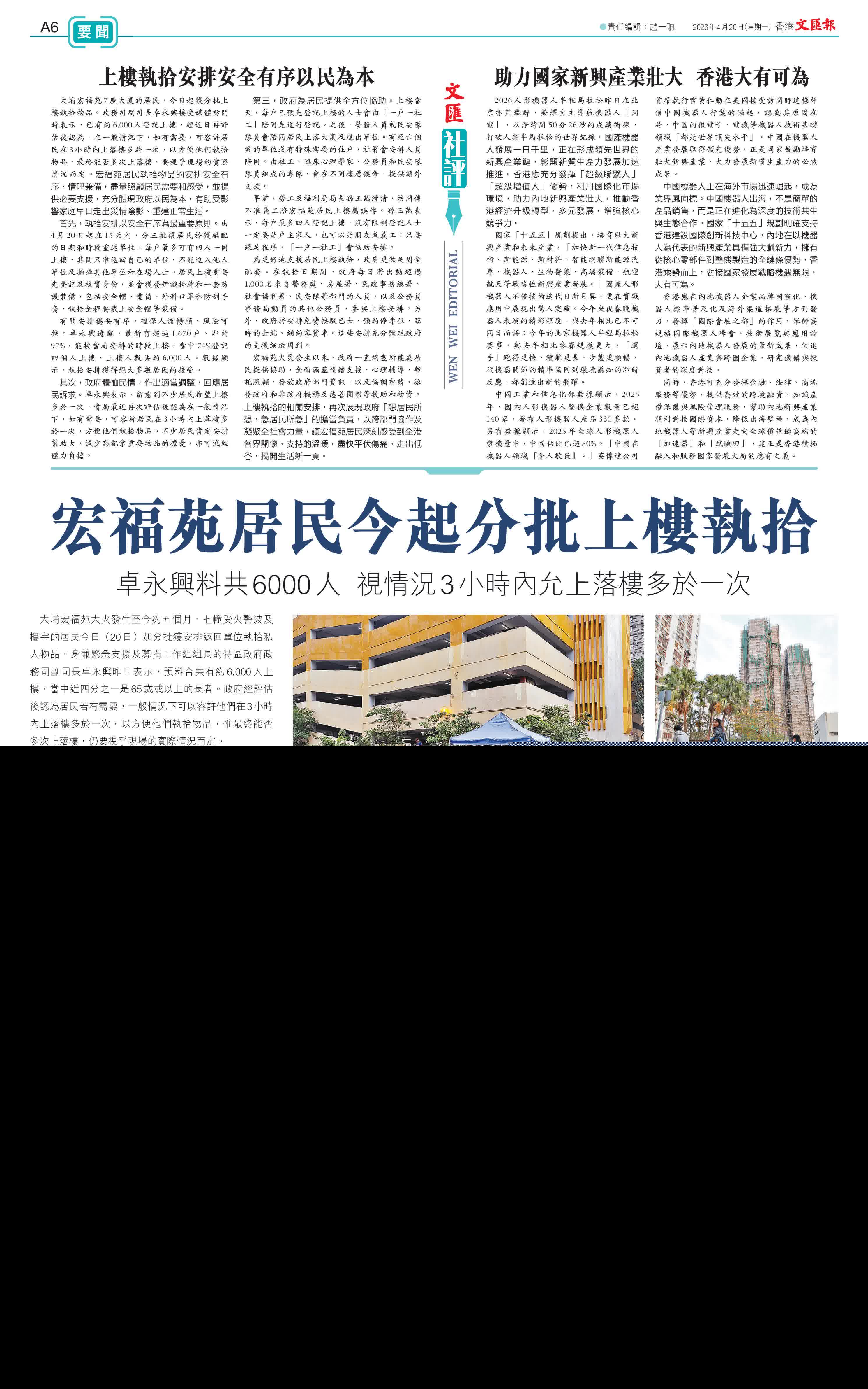 (香港文匯報記者 文森)大埔宏福苑大火發生至今約五個月,七幢受火警波及樓宇的居民今日(20日)起分批獲安排返回單位執拾私人物品。身兼緊急支援及募捐工作組組長的特區政府政務司副司長卓永興昨日表示,預料合共有約6,000人上樓,當中近四分之一是65歲或以上的長者。政府經評估後認為居民若有需要,一般情況下可以容許他們在3小時內上落樓多於一次,以方便他們執拾物品,惟最終能否多次上落樓,仍要視乎現場的實際情況而定。