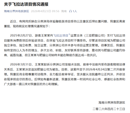 ·海南分界洲岛旅游区通报“游客蹦极受伤”:该案24日第二次开庭。
