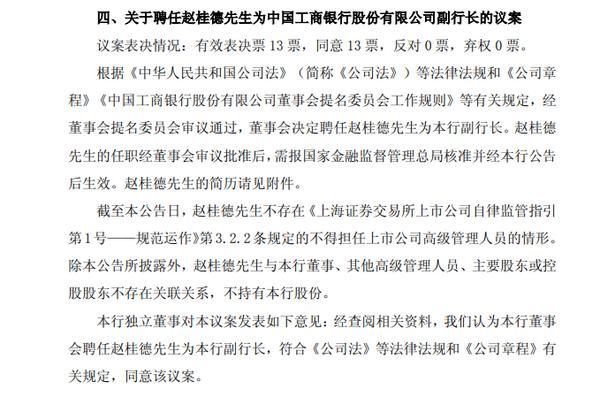 工商银行:聘任赵桂德为副行长