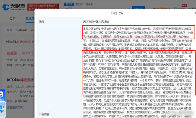 陈飞宇黑粉拒绝道歉被公告 被法院强制执行3万余元