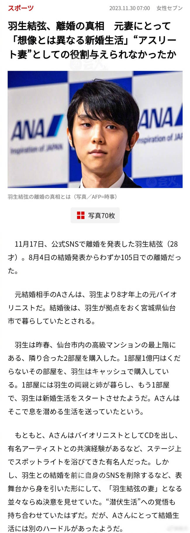 日媒曝羽生结弦离婚真相 妻子疑被其家人完全无视