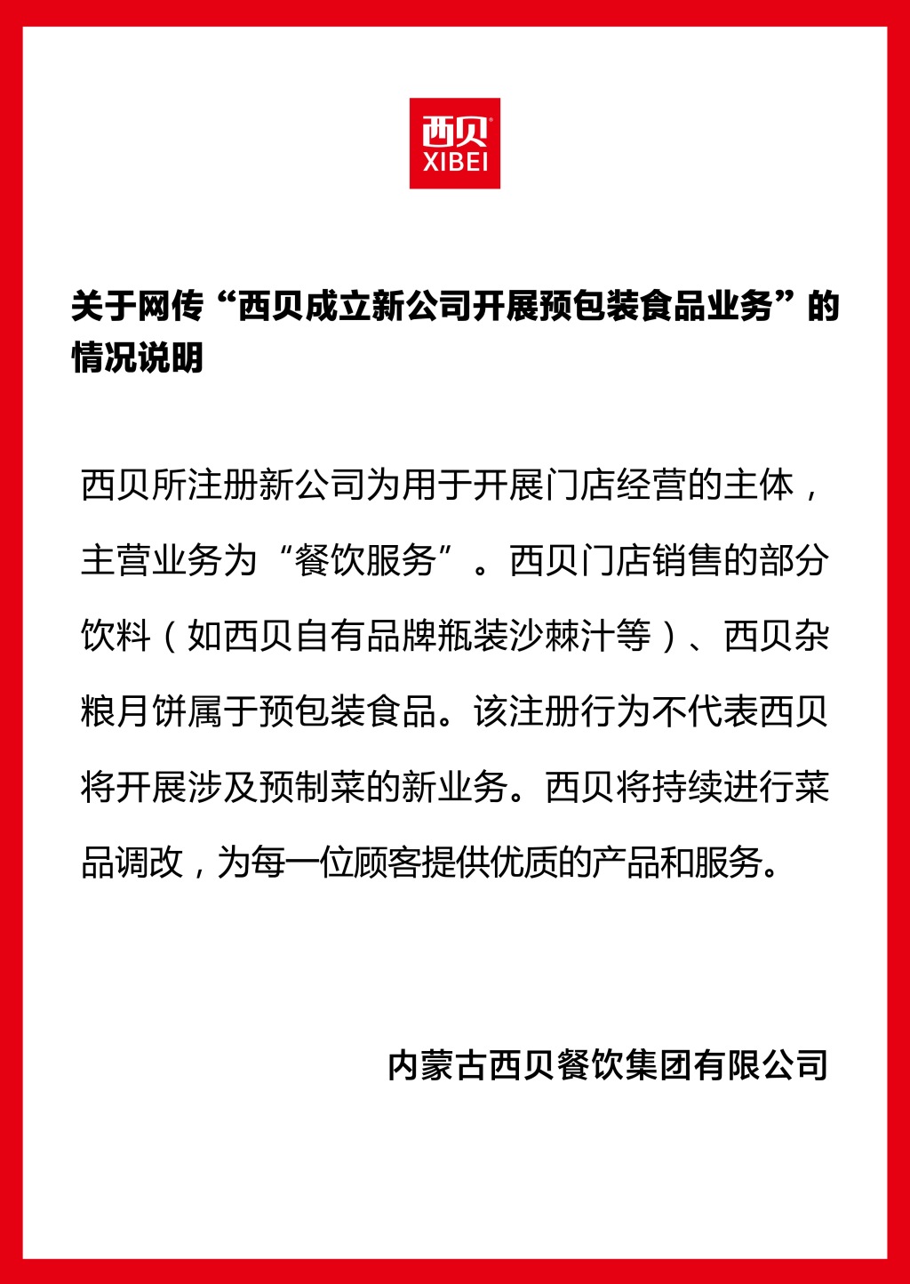 西贝回应“成立新公司卖预包装食品”:不代表公司开展涉及预制菜的新业务